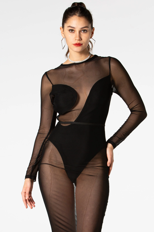 Look sophisticated and ultra-stylish in this glamorous Lilyana Black Mesh Bandage Dress. Crafted with classic black mesh and bandage fabric. this backless dress features sheer long-sleeves for a striking touch of elegance. Perfect for any evening event. this timeless piece of luxury is guaranteed to be an unforgettable addition to your wardrobe.