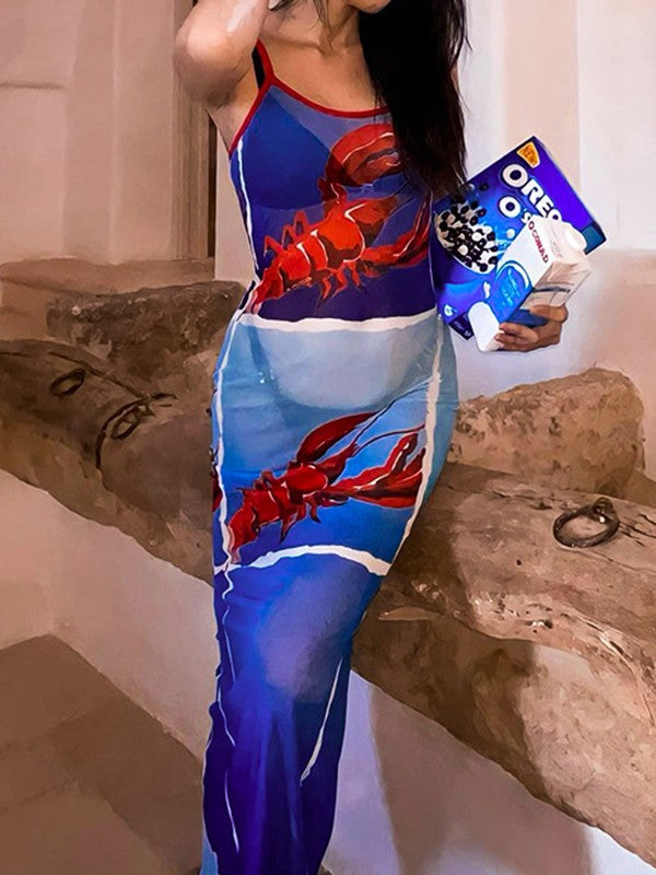 Description: This such cute dress is made from stretch soft mesh fabric. shaped to a bodycon-cut silhouette. features lobster printed design. and has lettuce edge detailing.
