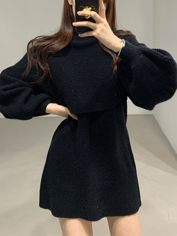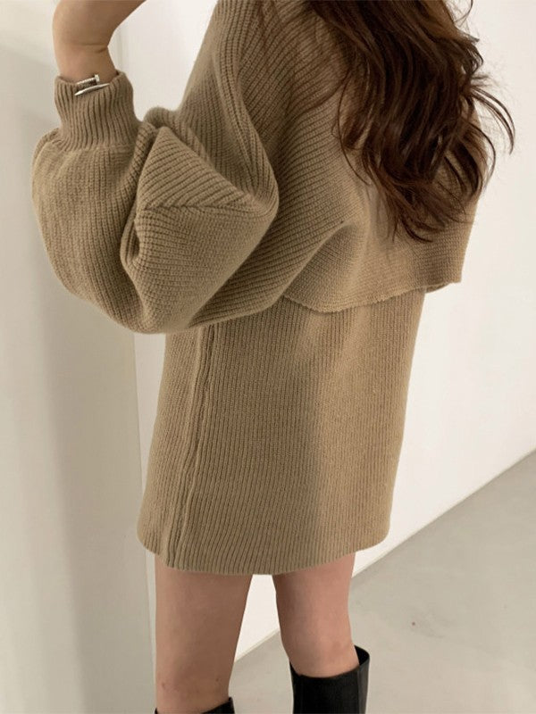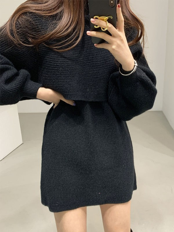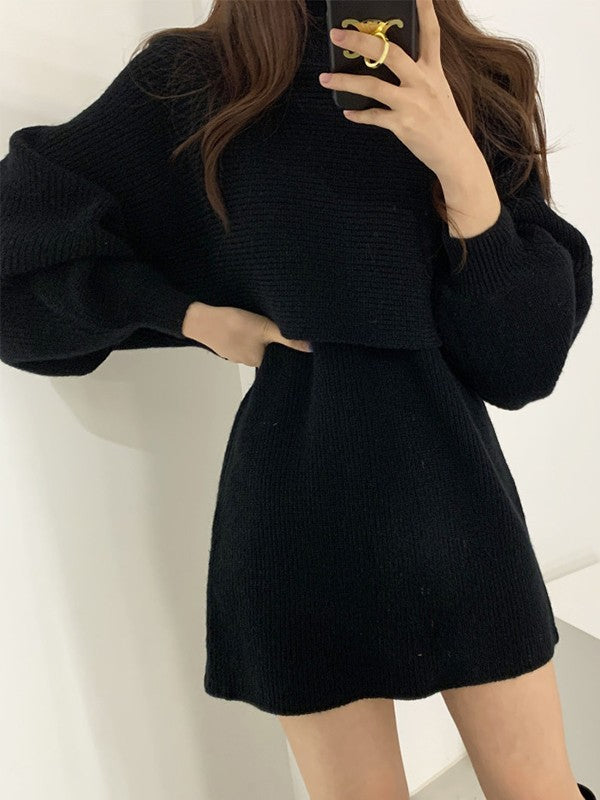 Description: Upgrade this effortless two piece set for go-to fall outfits. This set is made from cotton blend knit fabric. it has a cropped jumper features turtleneck style. matching with a mini dress with a slim cut silhouette.
