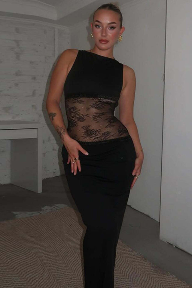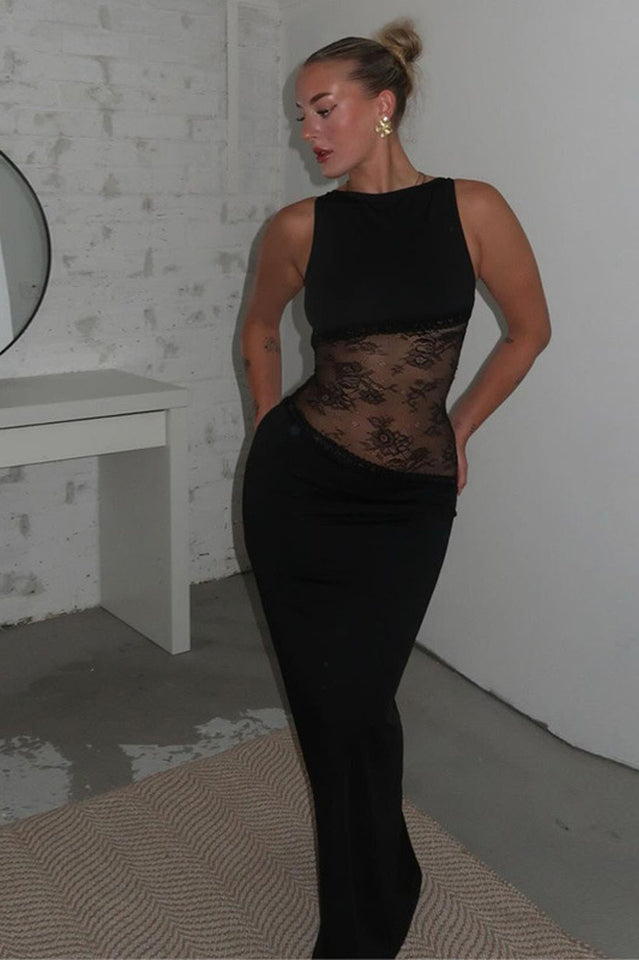 The Lucinda Maxi Dress boasts a rounded neckline and a sleek stretch jersey fabric for a flattering fit. Its low back adds a touch of elegance. making it a perfect choice for effortless sophistication at any event.