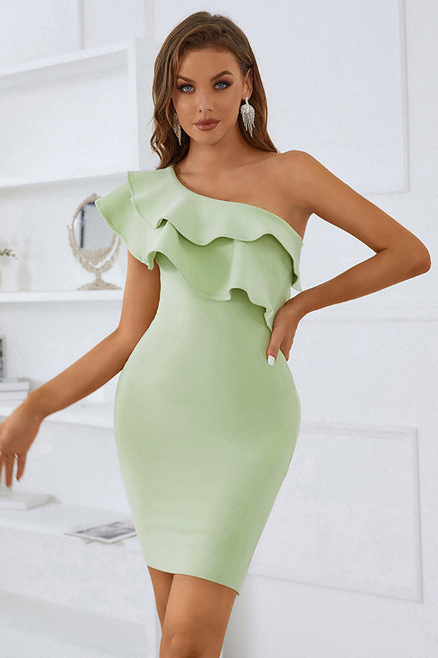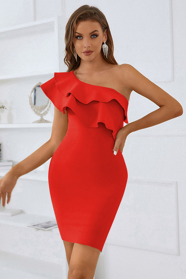 Be the loveliest of them all wearing this attractive Luluna Ruffle One Shoulder Dress. This features an asymmetrical neckline with one shoulder and ruffle detail. This mid-thigh length dress forms a fitted sheath silhouette. This dress design is perfect for women looking for that stunning form-fitting style.