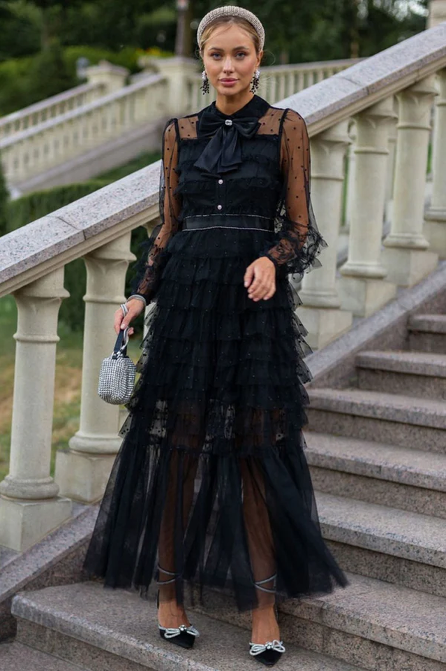 Need a comfortable and decent dress at work? Why not choose our Maddison Polka Dot Maxi Dress? Dress in polka-dot printed fabric with a black bow at the polo neckline and sheer mesh for a touch of mystery. Elegant in style. this wardrobe must-have dress. Complete the look with heels.