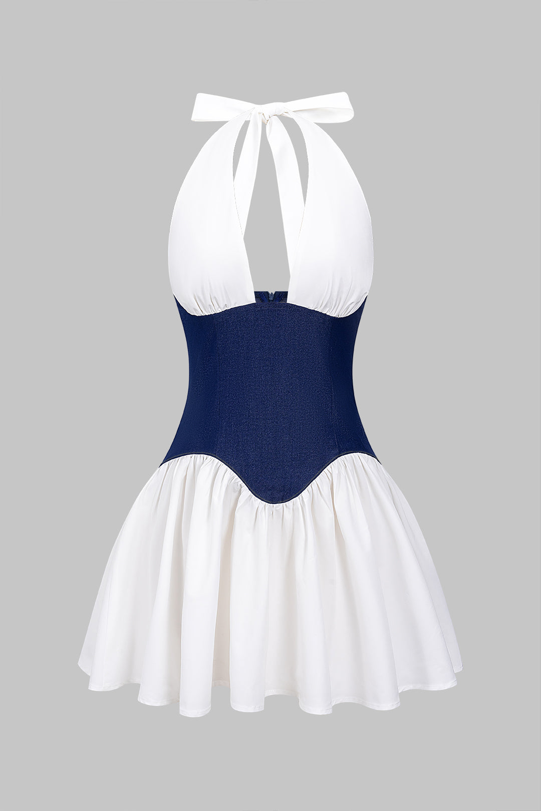 Denim Patchwork Halter Neck Backless Sleeveless Mini Dress