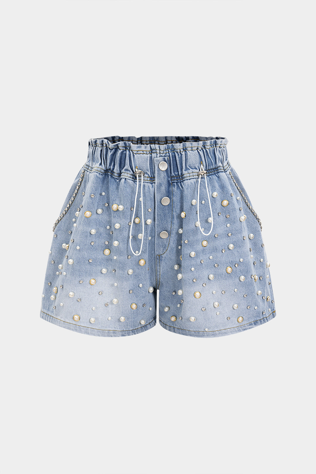 Denim Beaded Rhinestone Drawstring Wide Leg Jorts