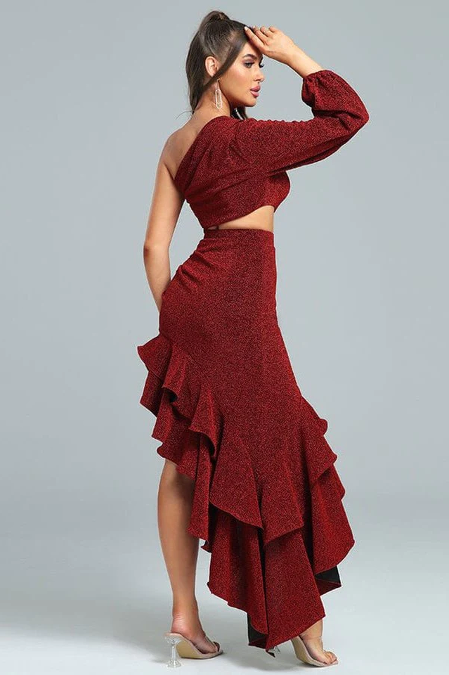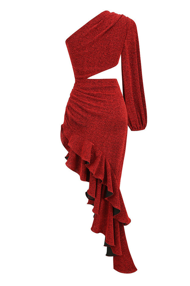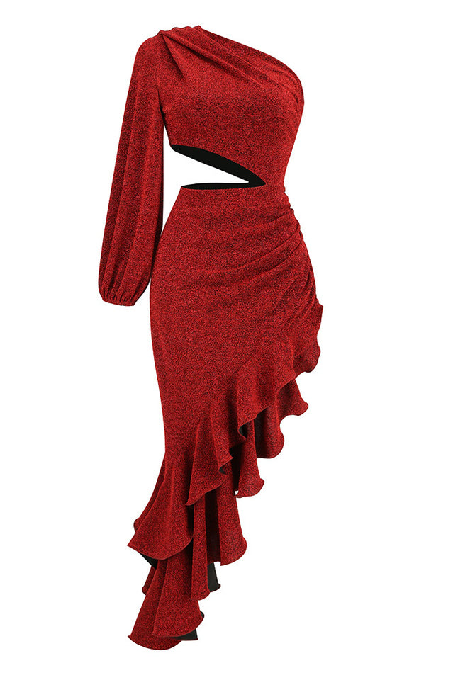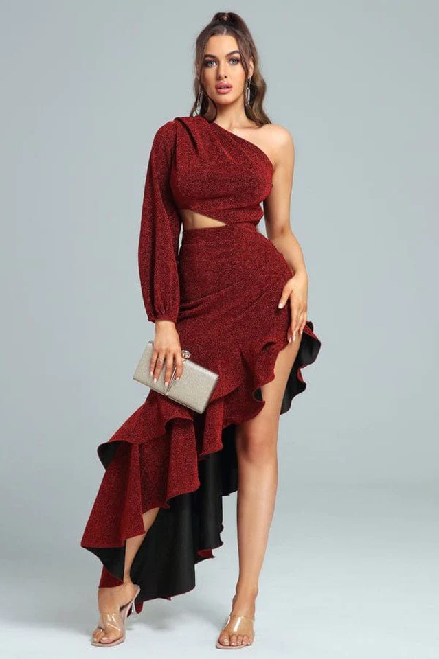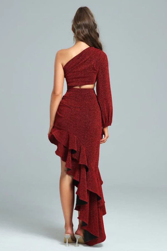 Megan One Shoulder Ruffle Formal Dress is a statement dress that flatters the figure. This bodycon dress features an asymmetrical one-shoulder style with an exposed waist to enhance your look with a touch of sophistication. Crafted from a luxurious midweight stretch knit fabric. this dress offers an optimal fit for a contemporary. timeless look.