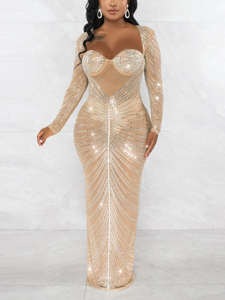 Mesh Sheer Rhinestones Long Sleeves Dress