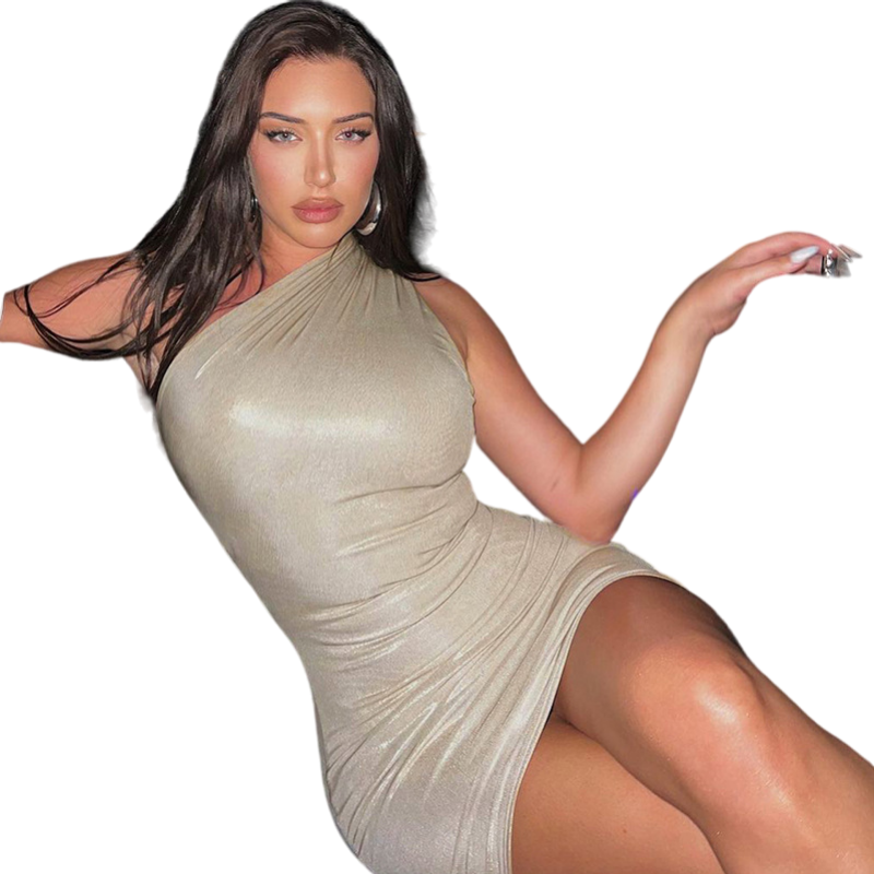The metallic-coated shoulder detail adds a touch of glamour and sophistication. catching the light and turning heads wherever you go. With its one-shoulder neckline and sleeveless design. this dress exudes confidence and allure. making it the perfect choice for those hot summer nights.