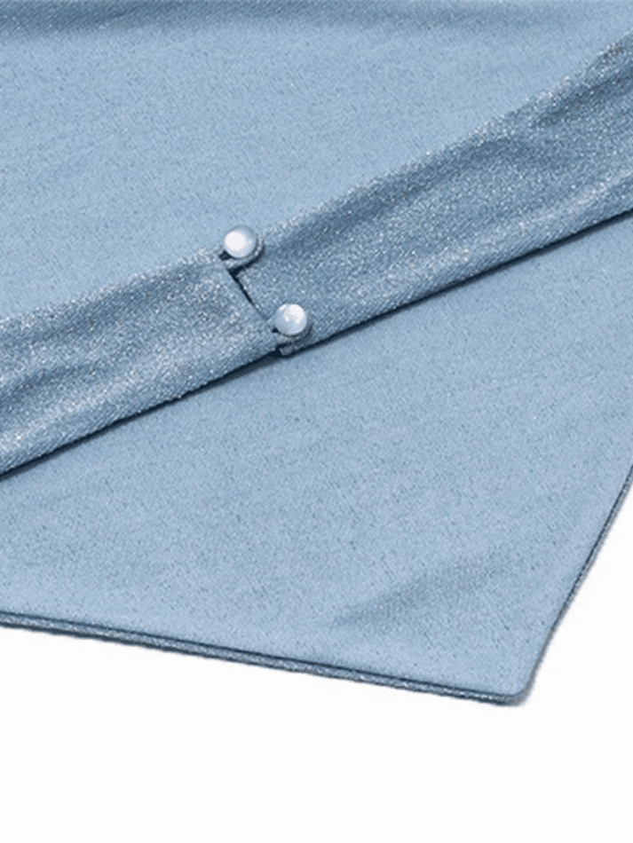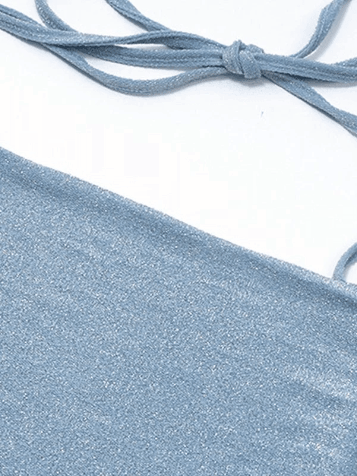 Description: Make a dazzling statement at night parties and clubs with this shimmering metallic halter top. Crafted from glossy fabric. it boasts an adjustable wrap-around tie neck style and a pointed hemline. Fastened with two buttons at the back for added allure.
