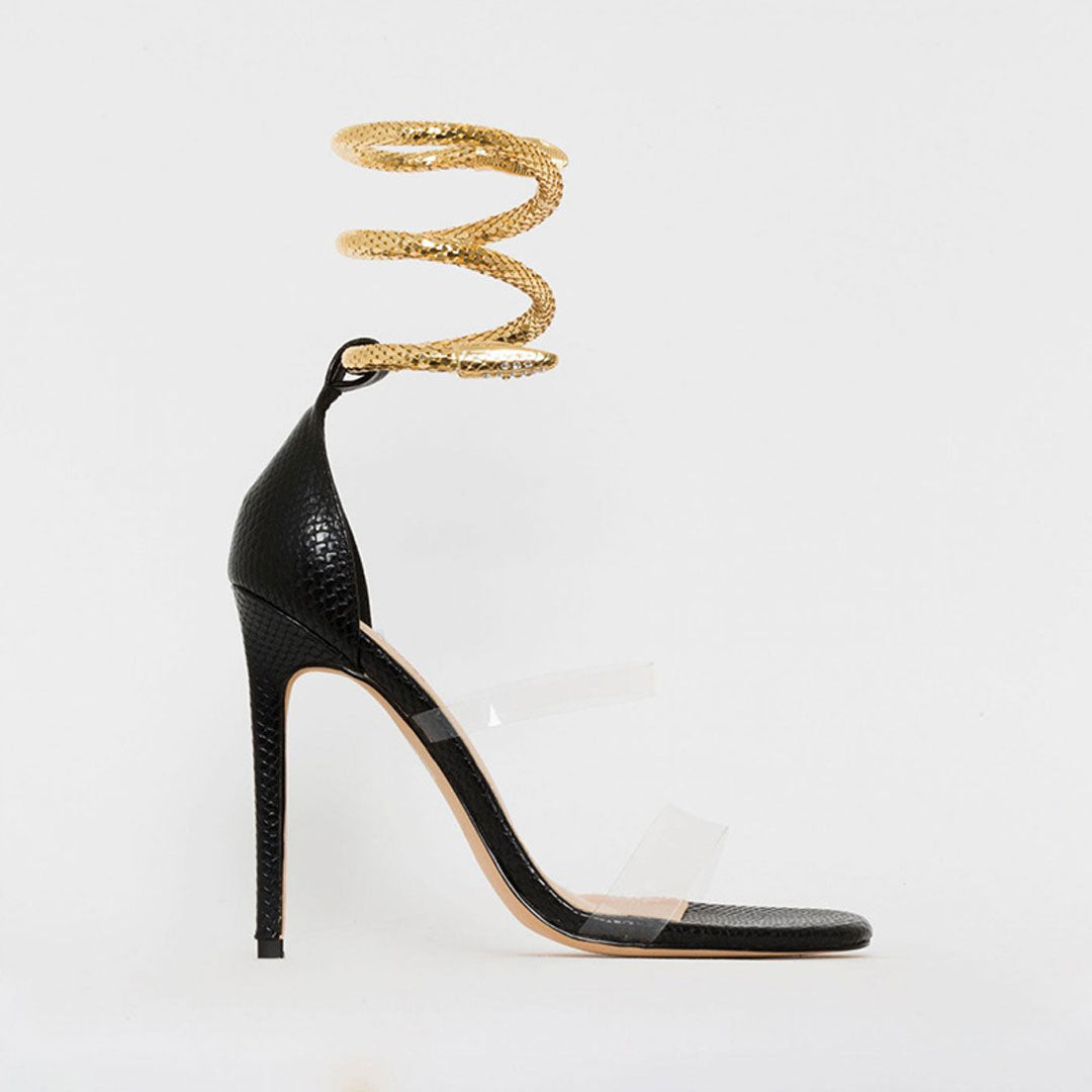 The wild motif high-heel sandals form a stunning statement without even trying. Crafted with faux leather. clear PVC and rubber. embellished with an adjustable wrap-around ankle strap in metallic gold-tone color beaded with sparkly rhinestones. featuring a snake-embossed texture. an almond square open toe design followed by transparent vinyl upper straps. a comfortable man-made footbed structured with a synthetic lining. a stable stiletto high heel anchored by a rubber heel cap. Find more trendy women's wraparound heels and unique shoes in our boutique. and wear them for an eminently wearable style and look chic and elegant - Heel height: 11cm.