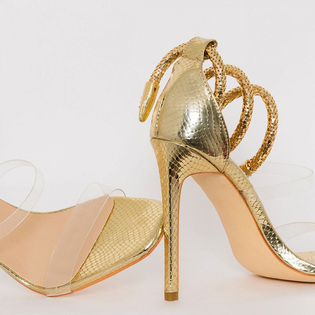 The wild motif high-heel sandals form a stunning statement without even trying. Crafted with faux leather. clear PVC and rubber. embellished with an adjustable wrap-around ankle strap in metallic gold-tone color beaded with sparkly rhinestones. featuring a snake-embossed texture. an almond square open toe design followed by transparent vinyl upper straps. a comfortable man-made footbed structured with a synthetic lining. a stable stiletto high heel anchored by a rubber heel cap. Find more trendy women's wraparound heels and unique shoes in our boutique. and wear them for an eminently wearable style and look chic and elegant - Heel height: 11cm.