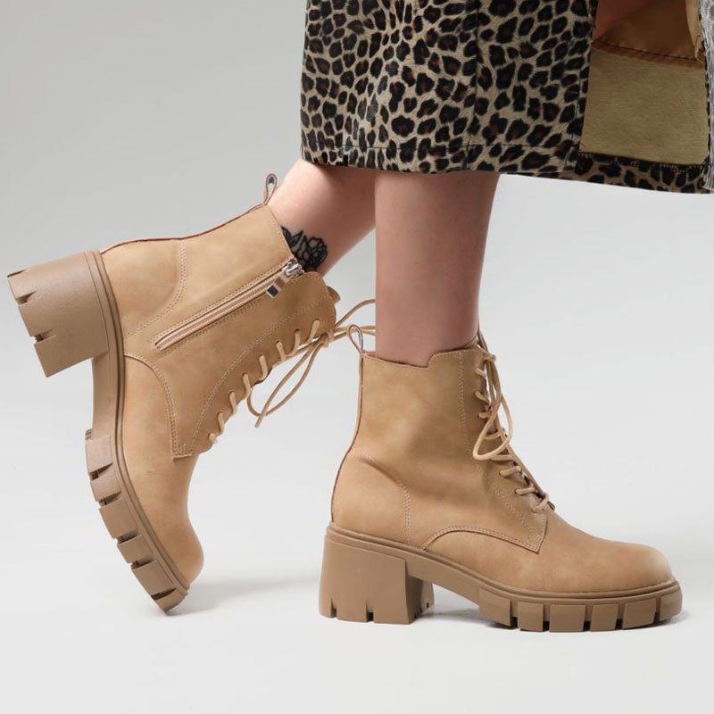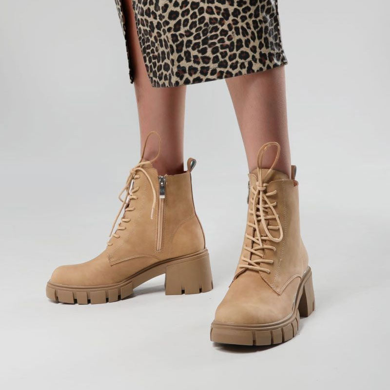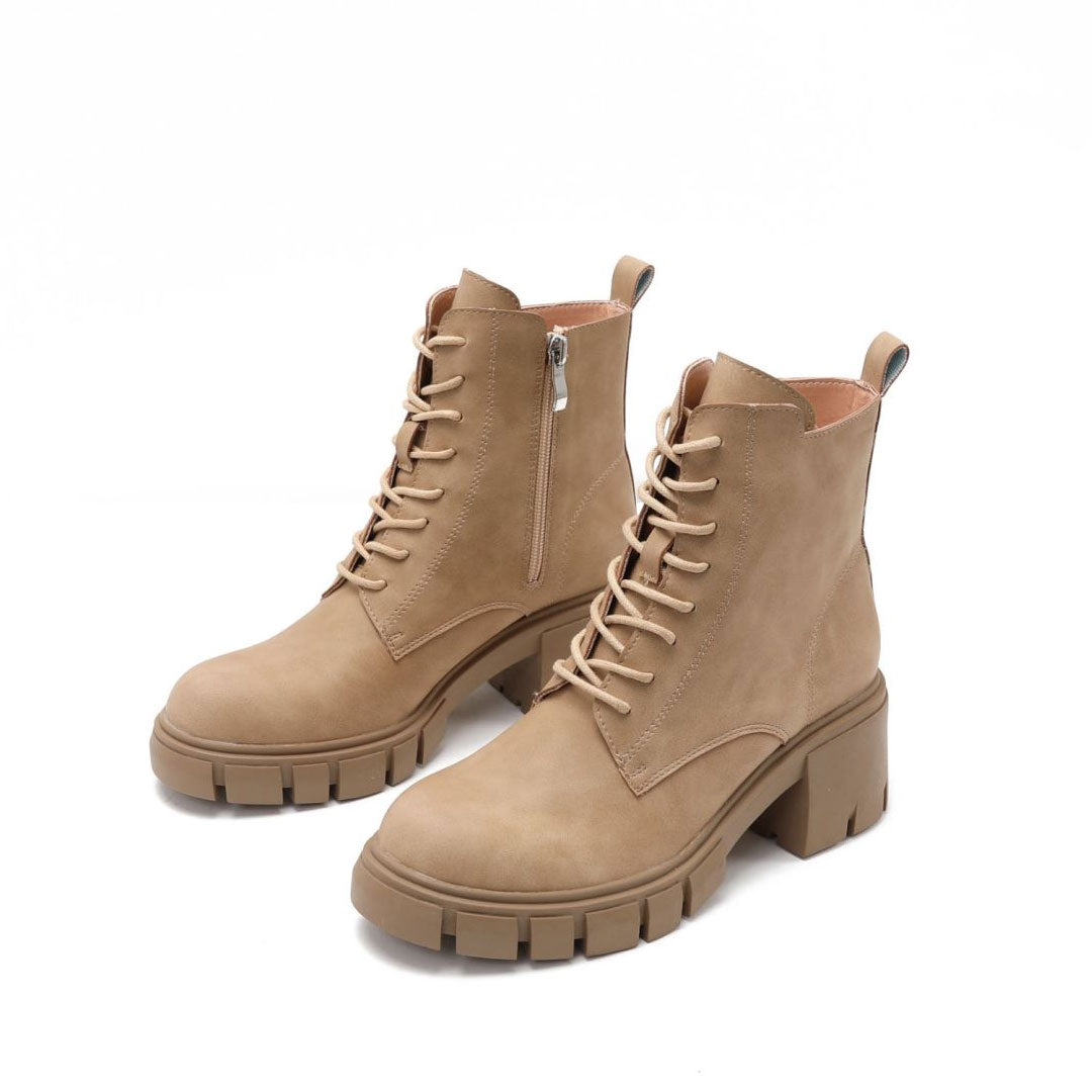 Toe Block Heel Lug Sole Lace Up Combat Boots - Apricot