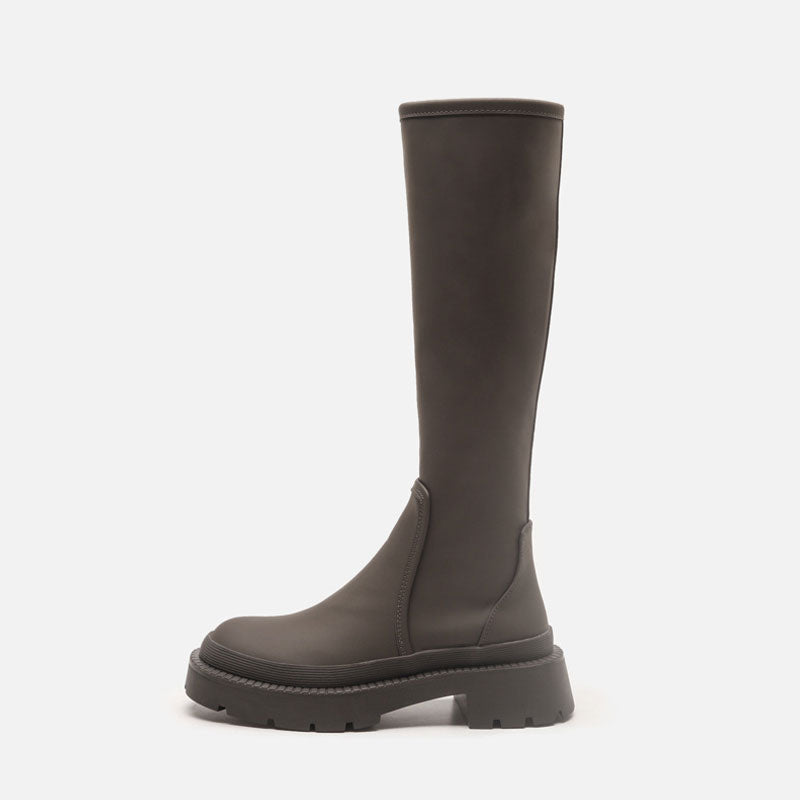 Put your best foot forward in these tubular boots! Crafted with smooth PU leather and rubber. stand out in panelled effects. featuring a round toe design enhanced a synthetic upper. a rubberized trim at welt. a cushioned footbed grounded with a lugged platform and a chunky block heel. a tall length complemented with a side zip. Find more trendy women's round-toe boots and unique shoes in our boutique. and wear them with a long sleeve ruched mini dress and a sparkly necklace to create an iconic look - Heel height: 4.3cm.