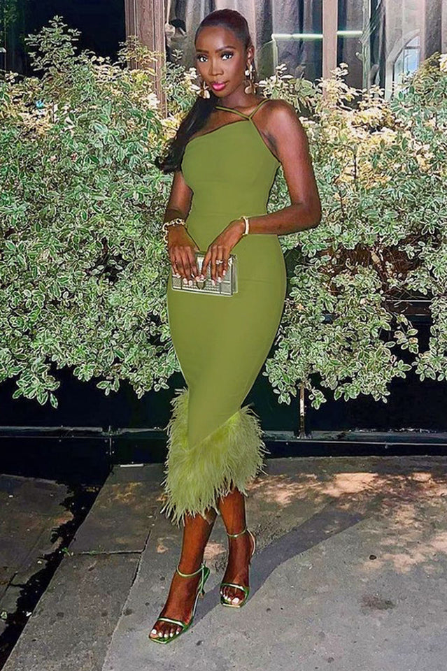 This feather midi dress is packed with show stopping glamour. It features a flattering asymmetric neckline with delicate straps. Cut from our stretch fabric in a tropical hue. she is falls to a flattering midi length and we love the wispy feathers that trim the hem.