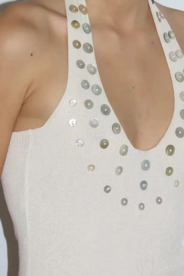 Neckline Embellished With Hand-Sewn Mother-of-Pearl Buttons.