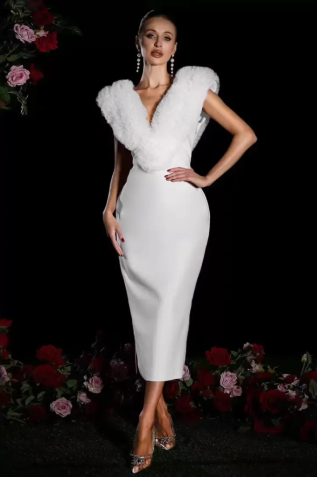 This dress is perfect for adding a touch of glamour to any occasion. The soft faux fur adds a luxurious touch while the sleeveless design keeps you cool and comfortable. Stand out in this stunning dress and make heads turn!