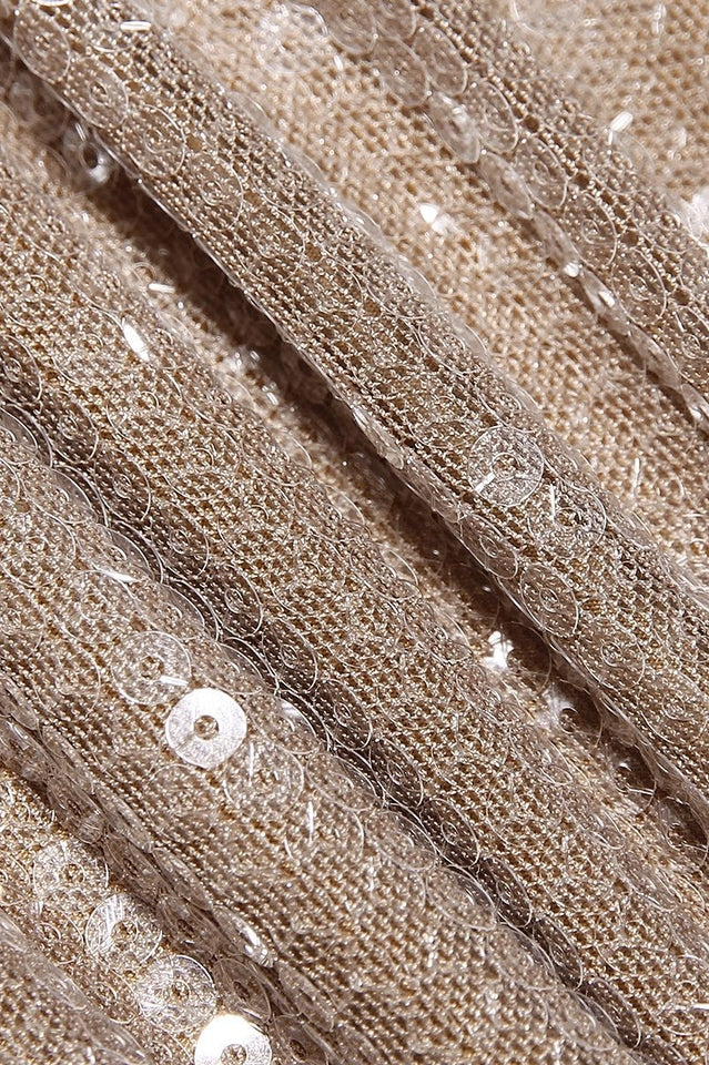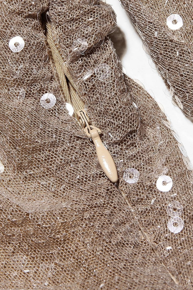 One Shoulder Beige Sequin Mini Dress with Puff Sleeve and Ruched Detail.