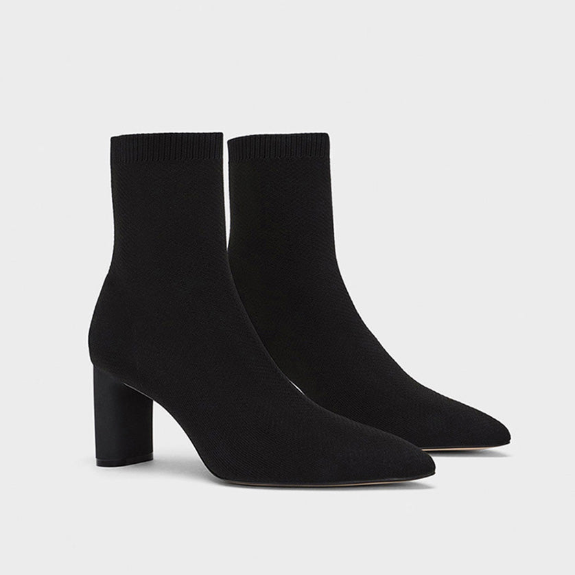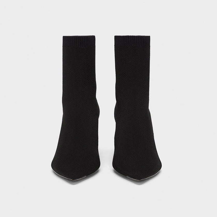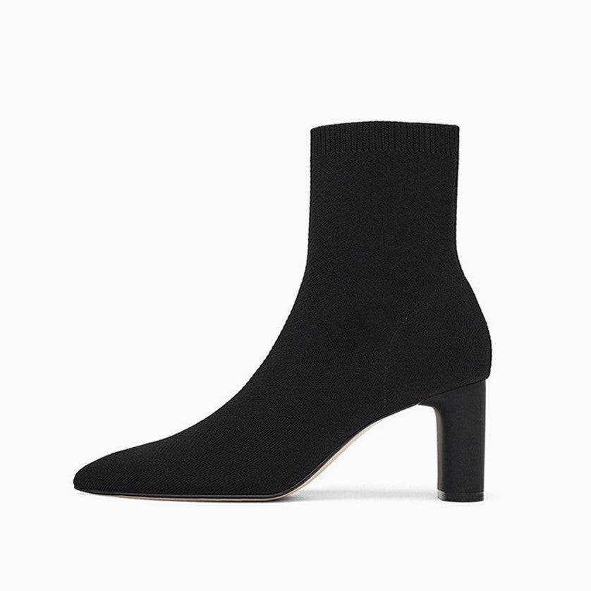 Pointed Toe Chunky Heel Mid Calf Sock Boots - Black
