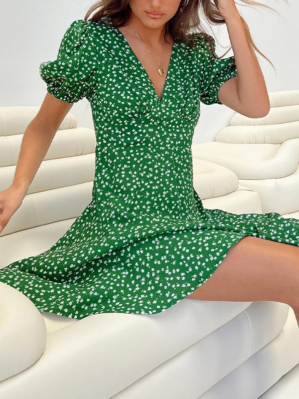Puff Sleeve Green Floral Mini Dress