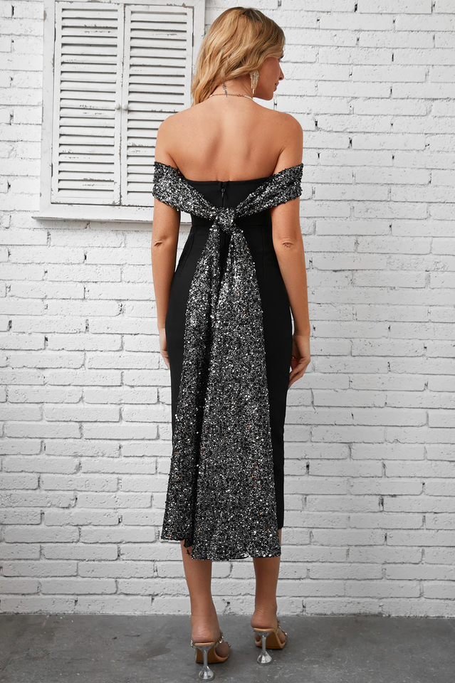 The Quirita dress is designed with elegance and sophistication in mind. Made with bandage materials and featuring a low sequin off shoulder neckline. it offers a timeless look that can be dressed up or down. The dress also features a sequin back long draped ribbon and an open back design. along with a midi length hemline and making it an exquisite ensemble dress when attend to an evening.