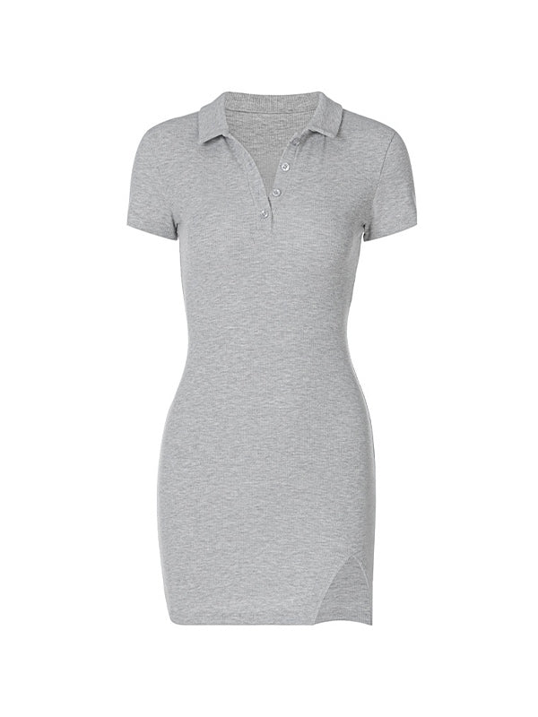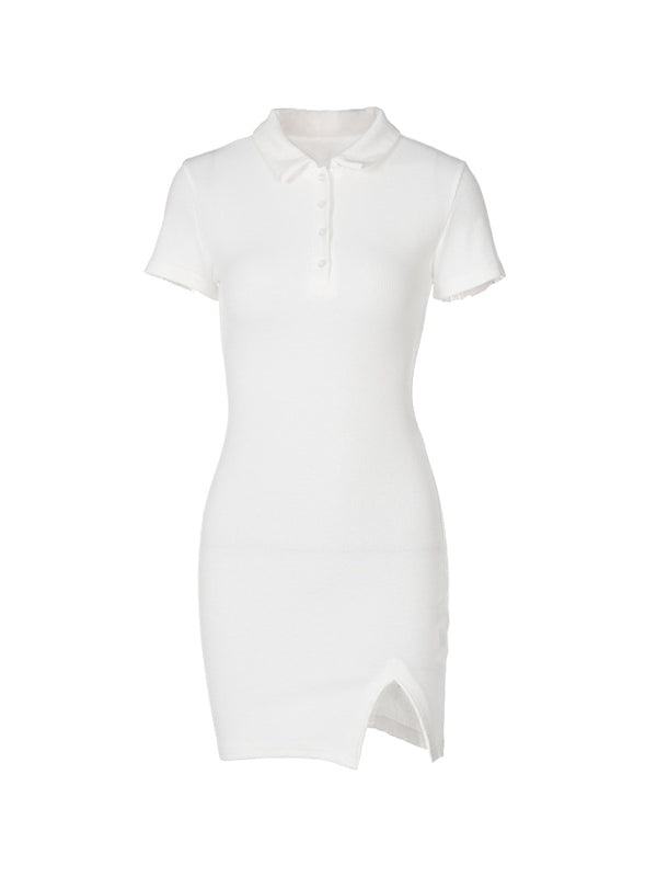 Description: Polo-neck style always give you a retro varsity vibe. This short-sleeved dress is made from stretchy ribbed fabric. cuts to a bodycon silhouette. features slit hem design. and has button fasten on the front.