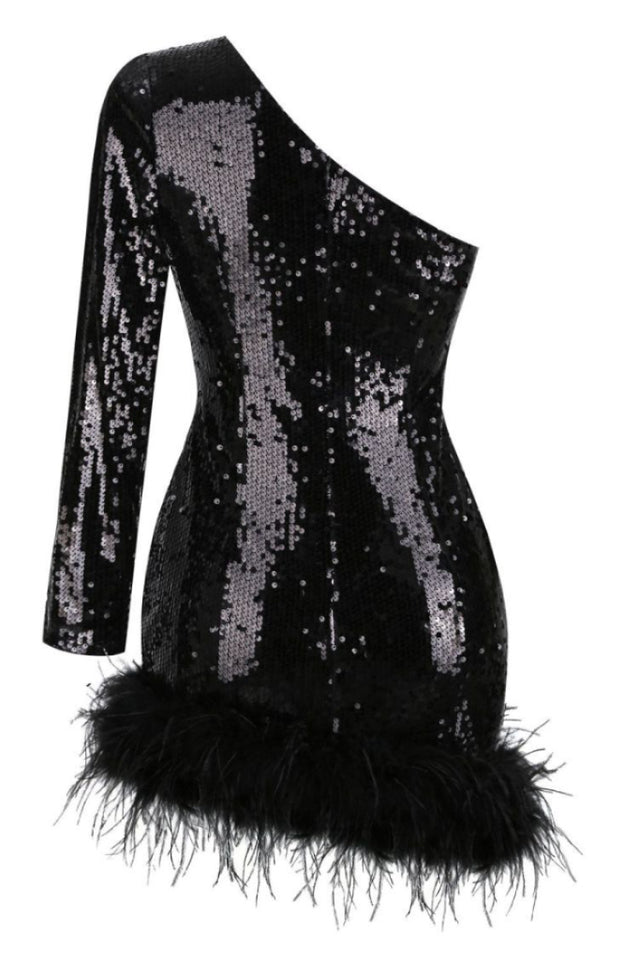 Romy One Shoulder Sequin Feather Mini Dress is super chic; the ultimate party dress to dance you through the night. Featuring all-over intricate sequin with a flirty feather asymmetric hemline you will make an entrance wearing her.