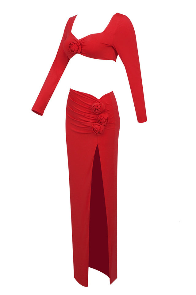 Featuring long sleeves and a high split. this dress is perfect for any occasion. The vibrant red color and beautiful flower design add a touch of elegance and charm. making you stand out in any crowd. Get ready to turn heads and feel confident in this must-have dress!