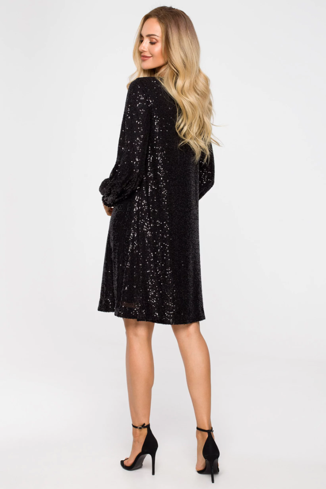 Sequins rule. so it's a total must-have in your wardrobe! A sequin dress with puffy sleeves is a perfect choice for New Year's Eve. but not only! It will also work well. for example. during a carnival party. at a wedding or a prom. You can wear it in two ways - loosely in a trapezoidal form or by emphasizing the waist with a belt. A model with a round neckline and puffy sleeves finished with an elastic band. which add chic and a unique character to the whole. The dress has a lining. so it fits beautifully on the body and is not transparent. Regardless of how old you are and what type of beauty you represent. you can wear sequins and shine on the dance floor!