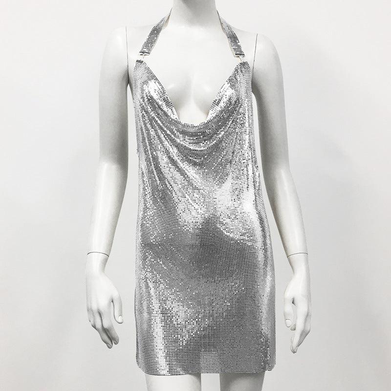 Introducing the "Sequined Metal Halterneck Cami Dress." your ultimate companion for a night of unforgettable fun and glamour. This nightclub party dress is designed to ensure you stand out from the crowd. featuring dazzling sequin detailing that catches the light with every move you make. The sexy backless design and the flirtatious split neckline combine to create a look that's both enticing and elegant. perfectly suited for the modern party-goer.