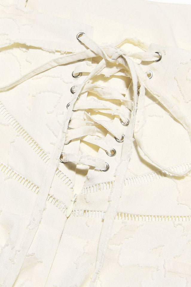 Serenita Vintage Cream Floral Mini Dress is made from a romantic floral jacquard in a gorgeous vintage cream. Beautifully decorated with pretty flowers. it has a flattering neckline with delicate rouleau shoulder straps. The fitted bodice features internal boning and we're loving the vintage style lace up back.