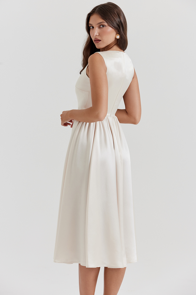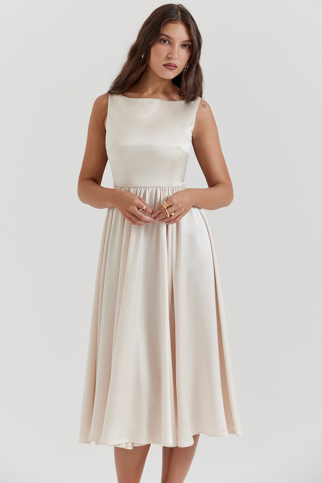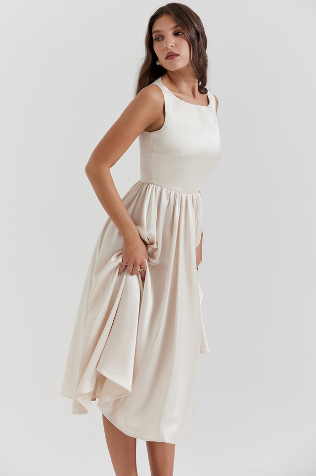 Our "Shayla" midi dress is a love affair with all things elegant. it's feminine. flowy and exudes quiet luxury. 'Shayla' is cut from glossy. silky satin and has a flattering figure-hugging bodice with a high collar and sleeveless silhouette. The gathered hem adds volume to the skirt and ensures it drapes beautifully around your figure. and the zipper at the back makes it easy to put on.