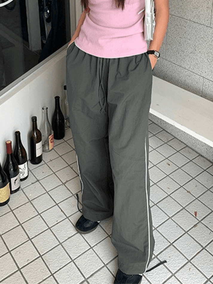 Description: Step up your fashion game with these retro sporty pants. They feature contrast piping details along the sides and a super relaxed silhouette. The loose fit and stretch waist make them comfortable for any casual occasion. With functional pockets and adjustable tie cuffs. these pants combine style and functionality effortlessly. Get ready to rock that retro vibe!