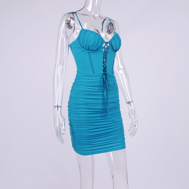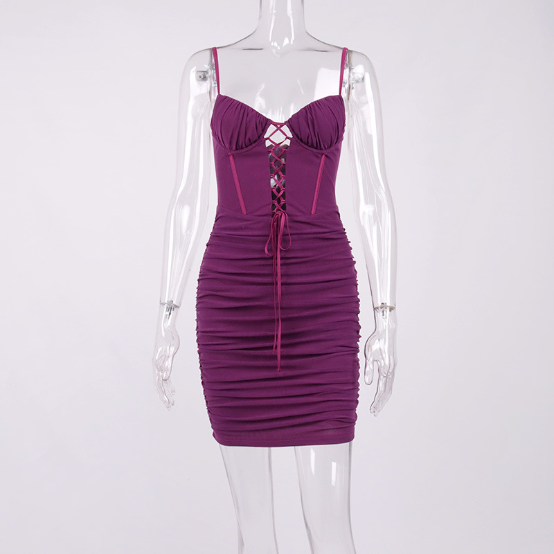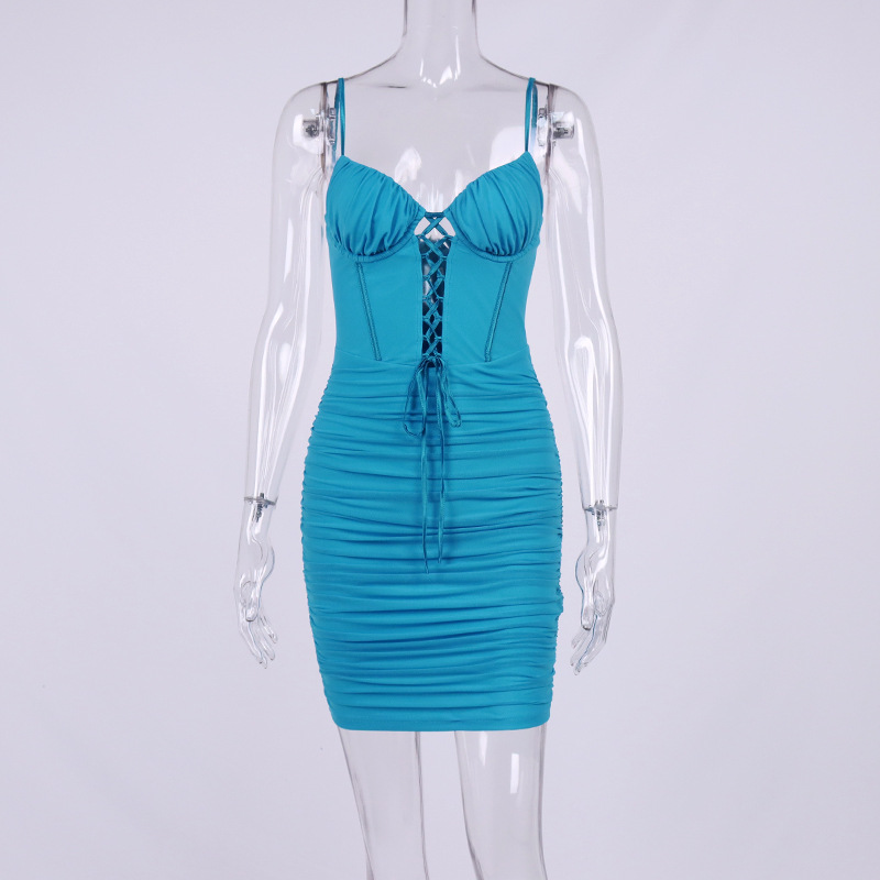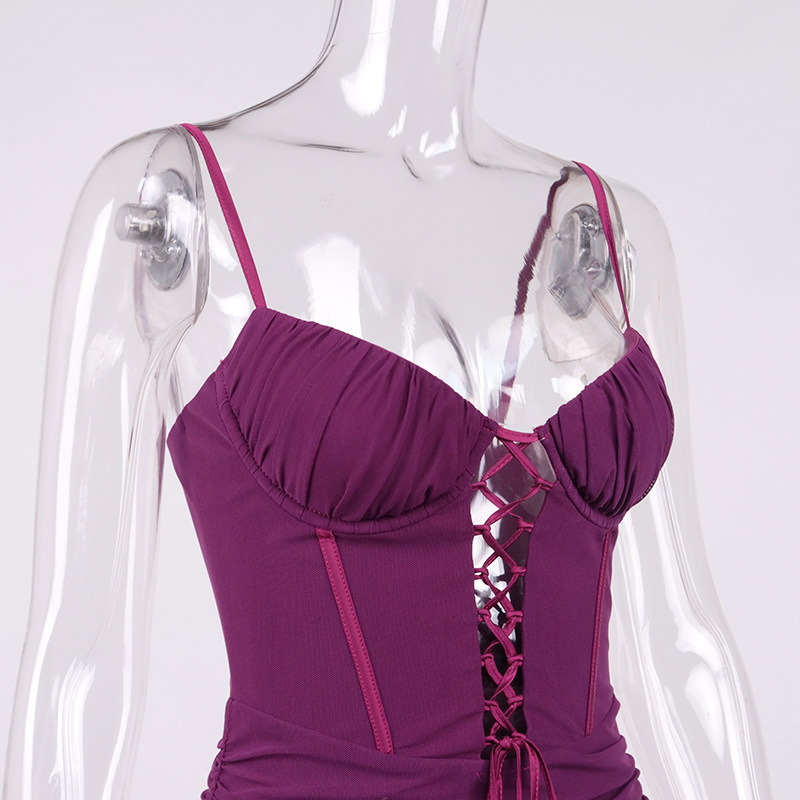 The daring backless design and hollow-out cutouts add a touch of sultry allure. while the lace-up detailing and ruched elements provide eye-catching texture and dimension. The V-neckline and sleeveless silhouette enhance the overall appeal. creating a look that's equal parts sexy and sophisticated.