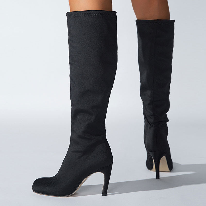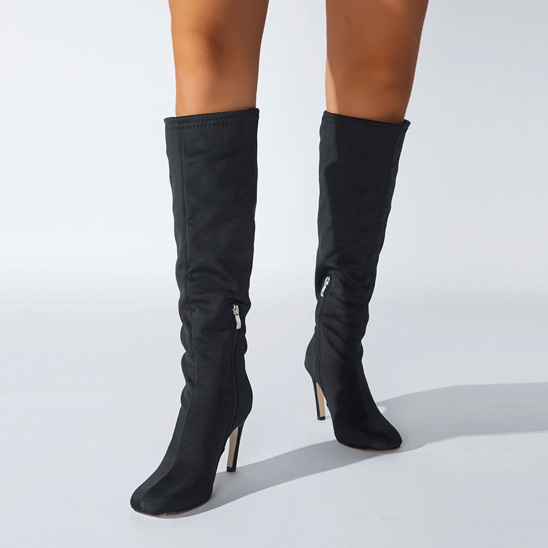 We are absolutely. positively obsessed with the high-heel boots! Made of a polished but not too sheen fabric and rubber. embellished with a architectural covered heel designed with a rubber heel cap. featuring a square closed toe. an upper dotted with bold seamed stitch detailing. a slightly cushioned footbed. a randomly scrunched shaft structured with a half-zipper at side. Find more trendy women's stiletto boots and unique shoes in our boutique. and wear them with a ruched mini dress and a shoulder bag for an edgy look - Heel height: 9cm.