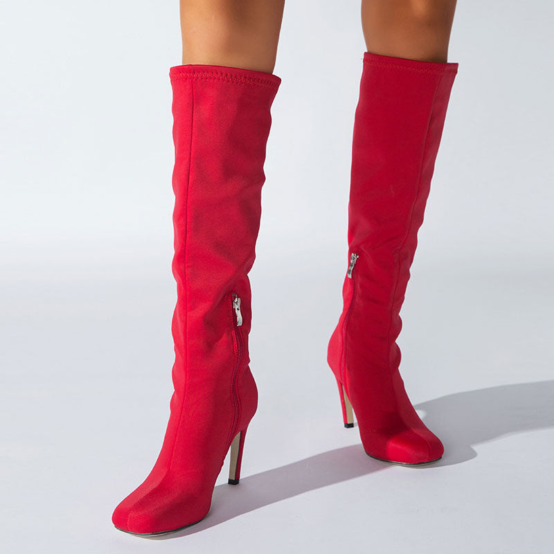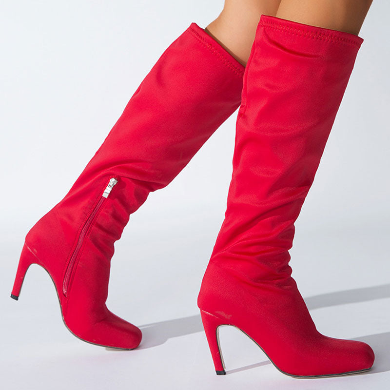 Slouchy Square Toe Side Zipper Stiletto Heel Knee High Boots - Red