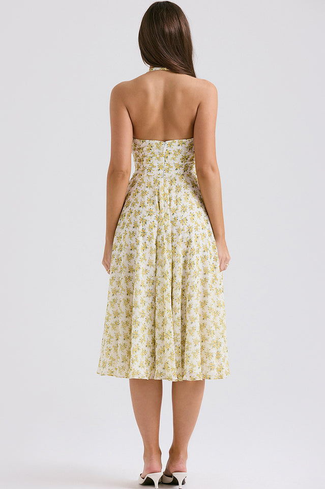 Solada Ivory Vintage Floral Print Sundress will stand out wherever you wear it due to the pretty print and vintage inspired fit. Cut from a floaty georgette. 'Solada' has a daring plunge neckline. flattering halter neck and turns to an open back.