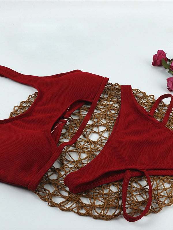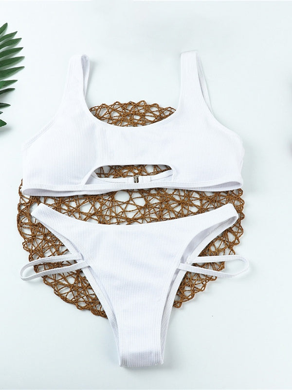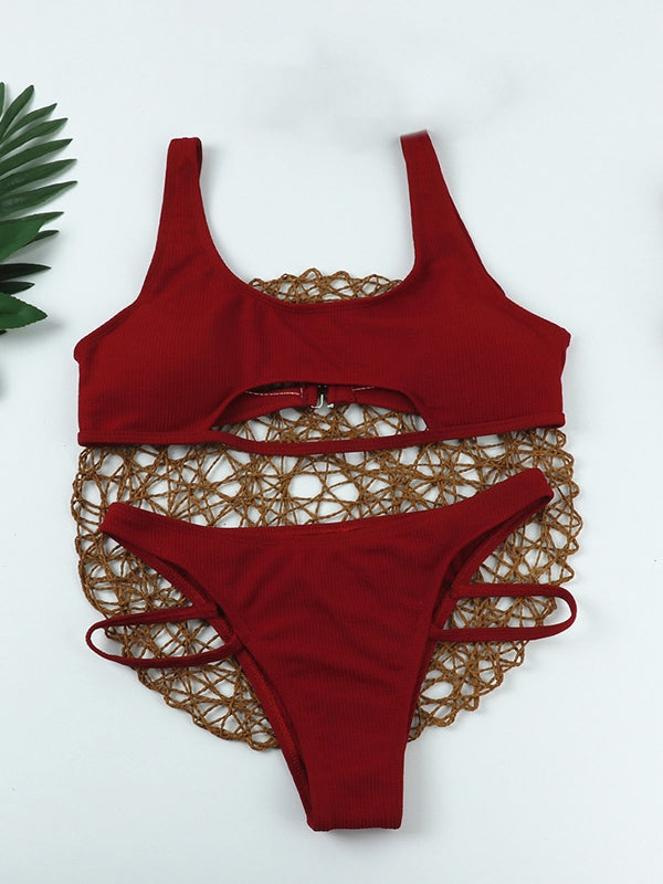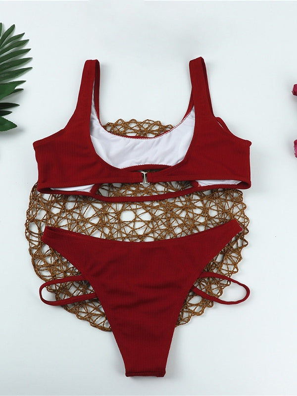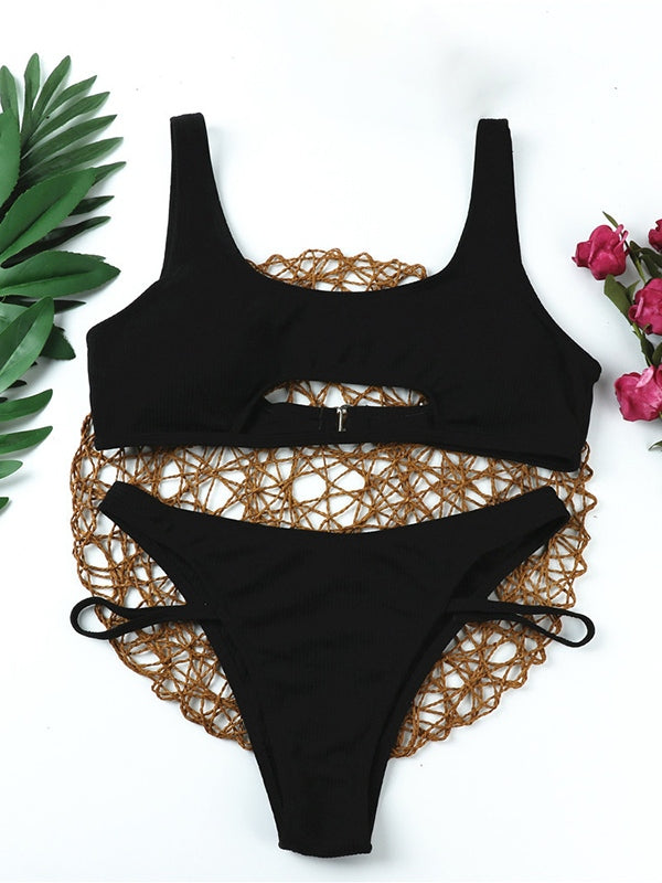Description: This two-piece bikini included a tank bikini top. features cutout on the front. and has hook fasten at back. With matching a cheeky bikini bottom features strappy waist design.
