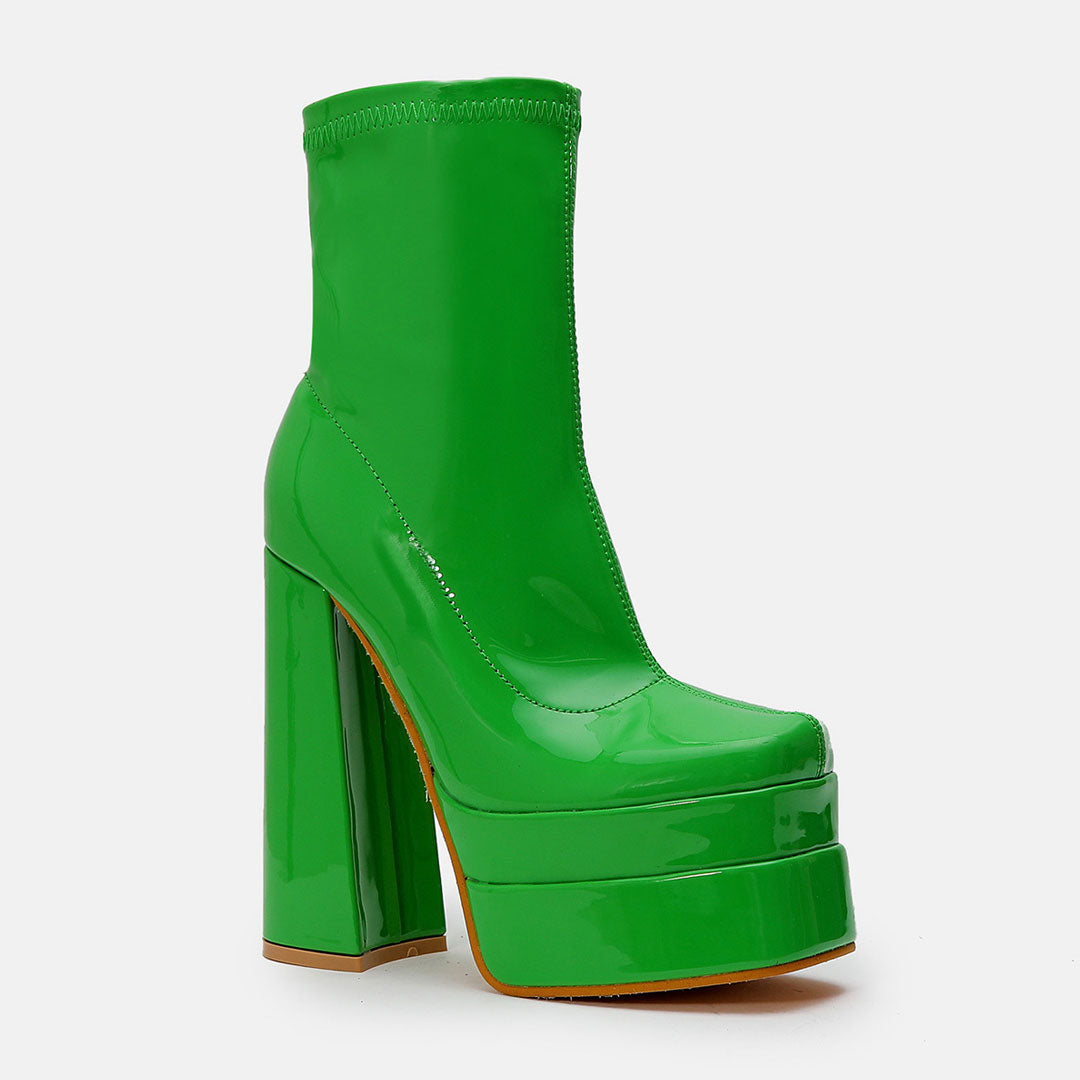 Solid Color Patent Chunky High Heel Platform Ankle Boots - Green
