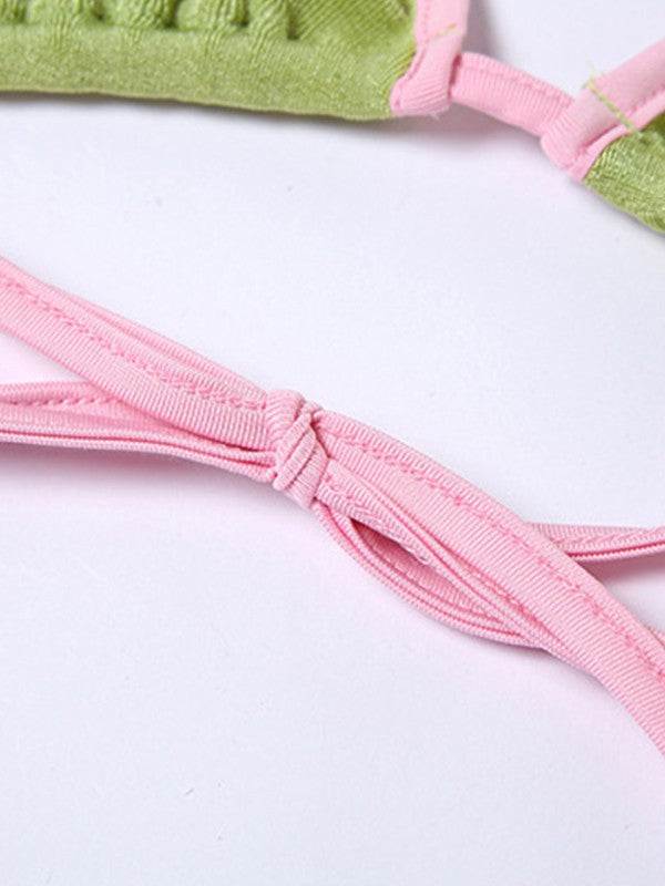 With a halter triangle bikini top. short sleeve cropped blouse. and a mini skirt set
