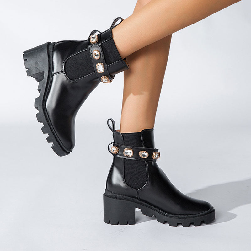 Give your everyday wardrobe a stylish upgrade with the patent ankle booties! Crafted with PU leather and rubber. embellished with dazzling semi-precious gemstones beaded at the ankle strap. featuring a round closed toe enhanced by a slightly varnish upper. a cushioned footbed anchored by a structured rubber heel. a slip-on styling framed by an elastic side gore and a pull tab at the opening. a lugged outsole accented with a non-skid detailing. Find more trendy women's round-toe boots and unique shoes in our boutique. and pair the lug-sole boots with a denim midi dress or a skirt matching set for an iconic look - Heel height: 7cm.