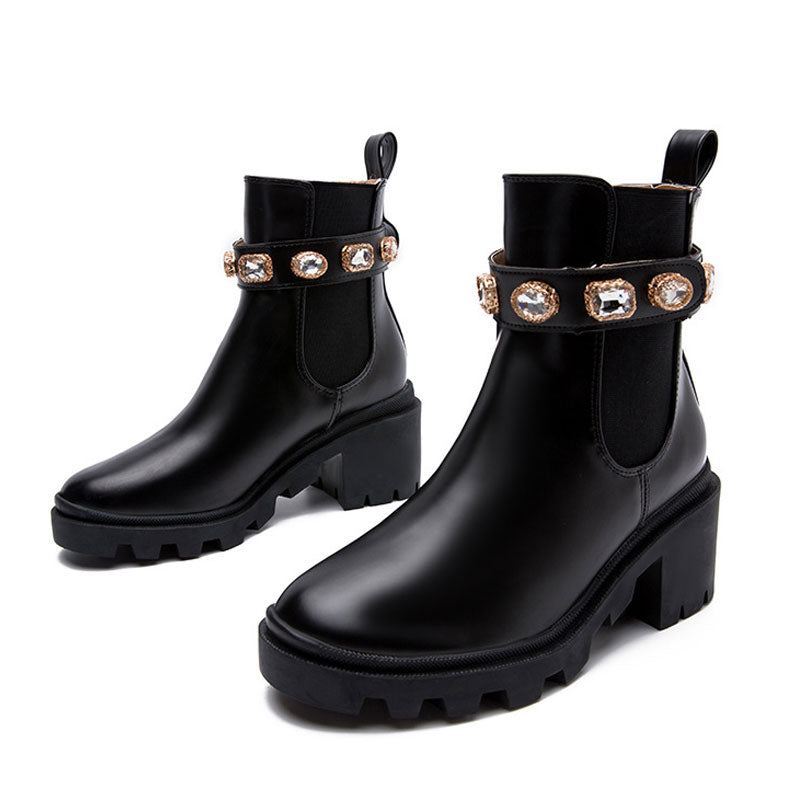 Sparkly Crystal Trim Lug Sole Round Toe Chunky Heel Ankle Boots - Black
