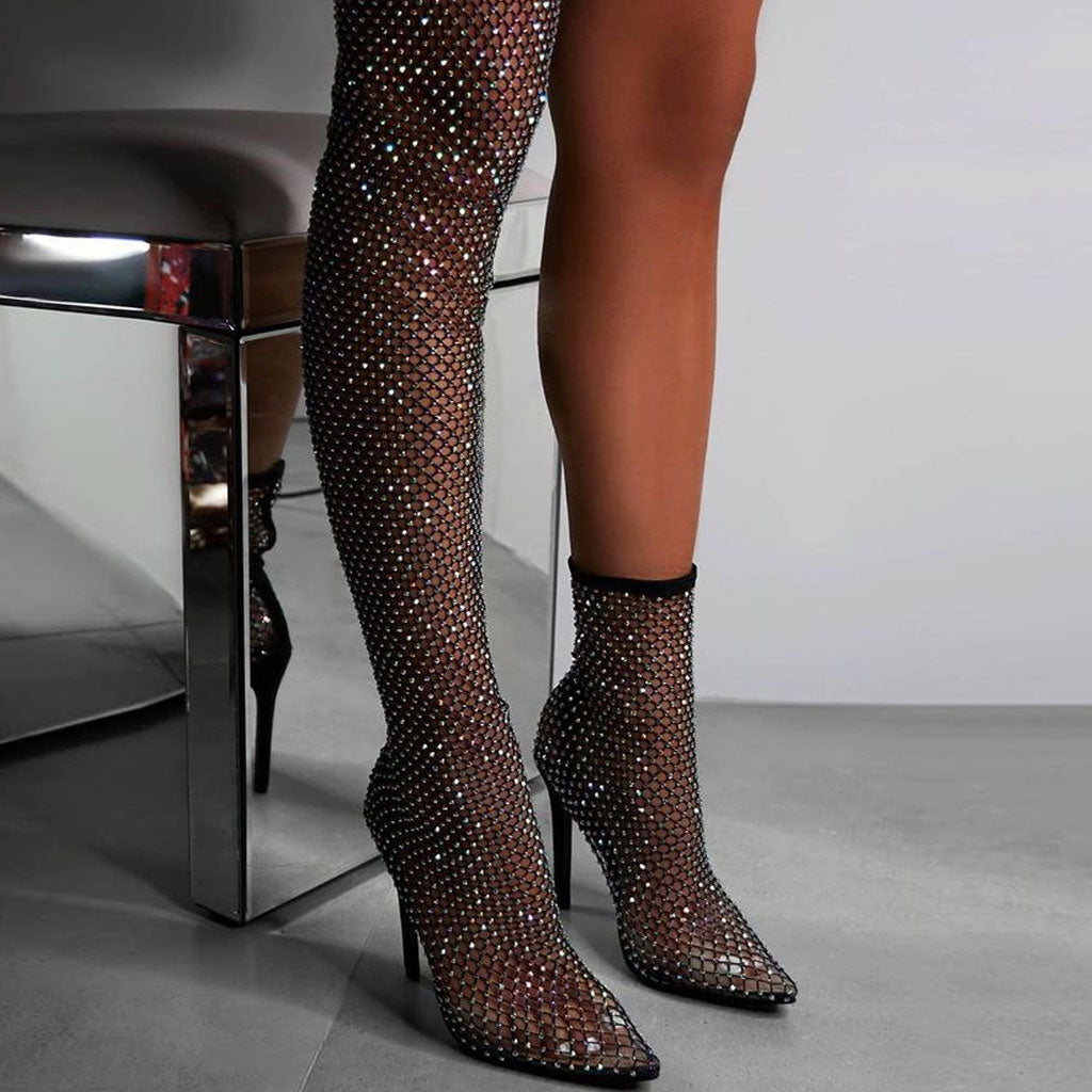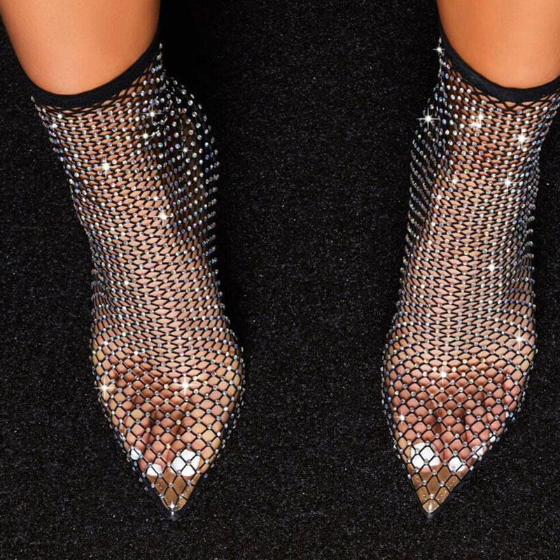 Sparkly Rhinestone Pointed Toe Naked Mesh Ankle Boots - Black