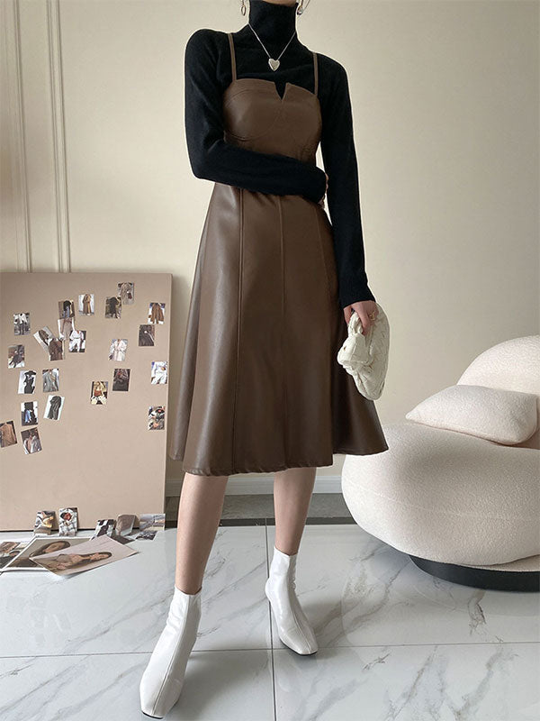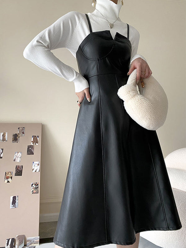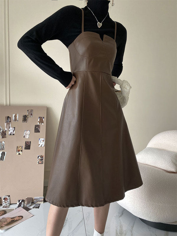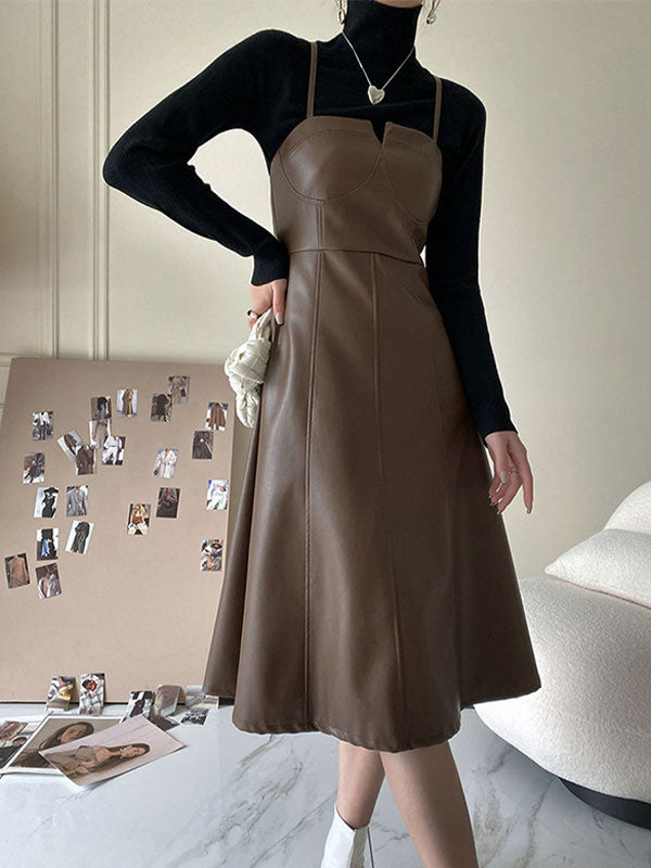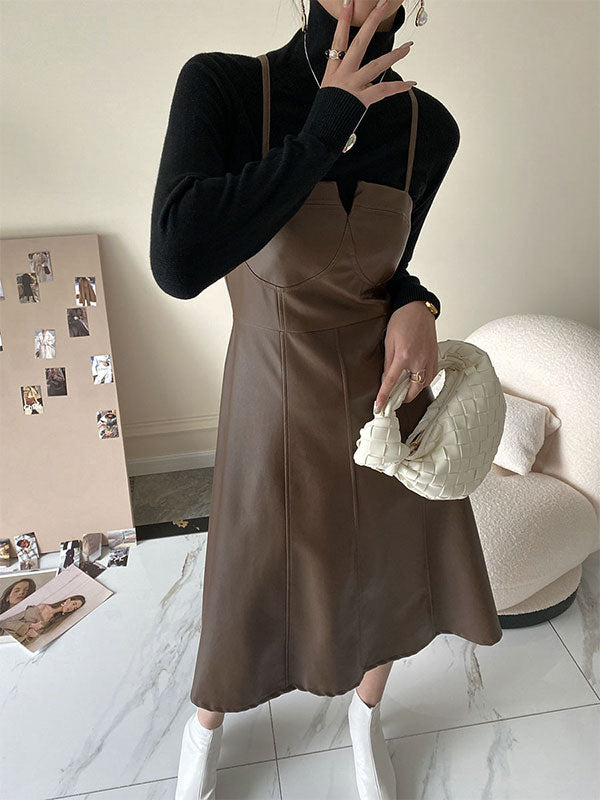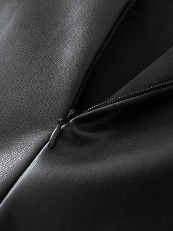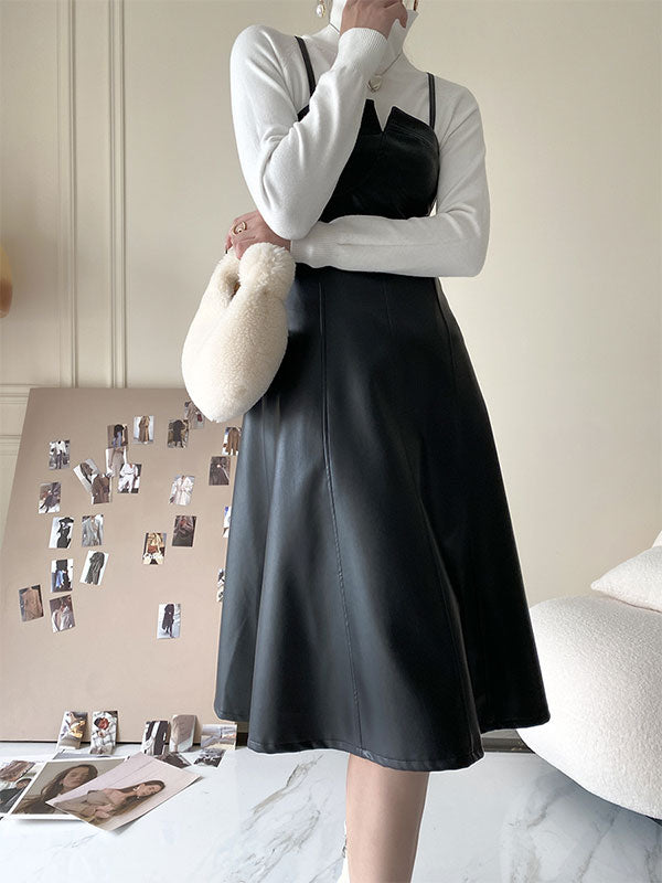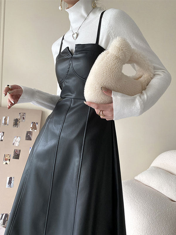 Spliced Pu Leather Slip Midi Dress