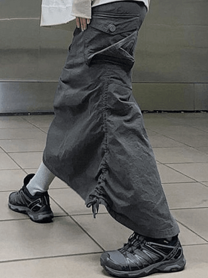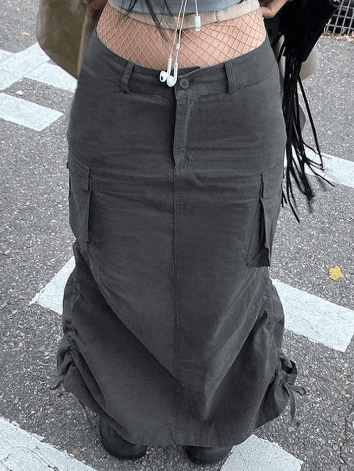 Description: Embrace the latest fashion trend with this lace-up cargo maxi skirt. Perfect for casual outings or street style looks. this skirt features a trendy lace-up design and convenient pockets for added functionality. Made from a blend of polyester and spandex. it offers a comfortable regular fit and falls gracefully as a maxi skirt. Express your unique style with this versatile piece that blends elements of Y2K. punk. hip pop. grunge. and vintage fashion.