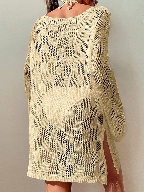 Description: This crochet dress shaped to a relax silhouette. features hollow out design. with split detail at hemline.