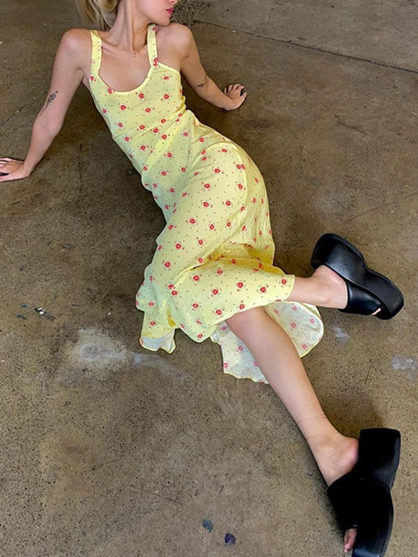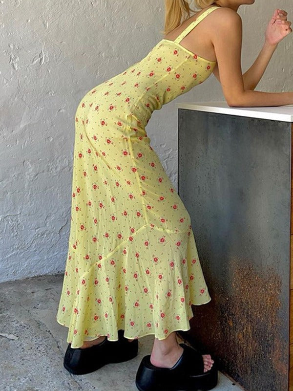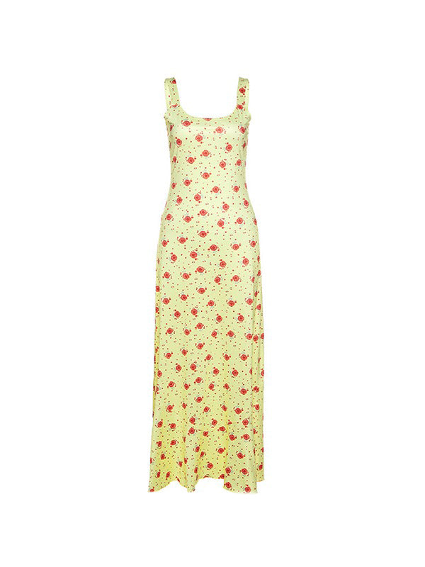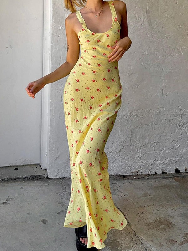 Description: This holiday long dress features thick shoulder straps. with allover floral print and open back design.