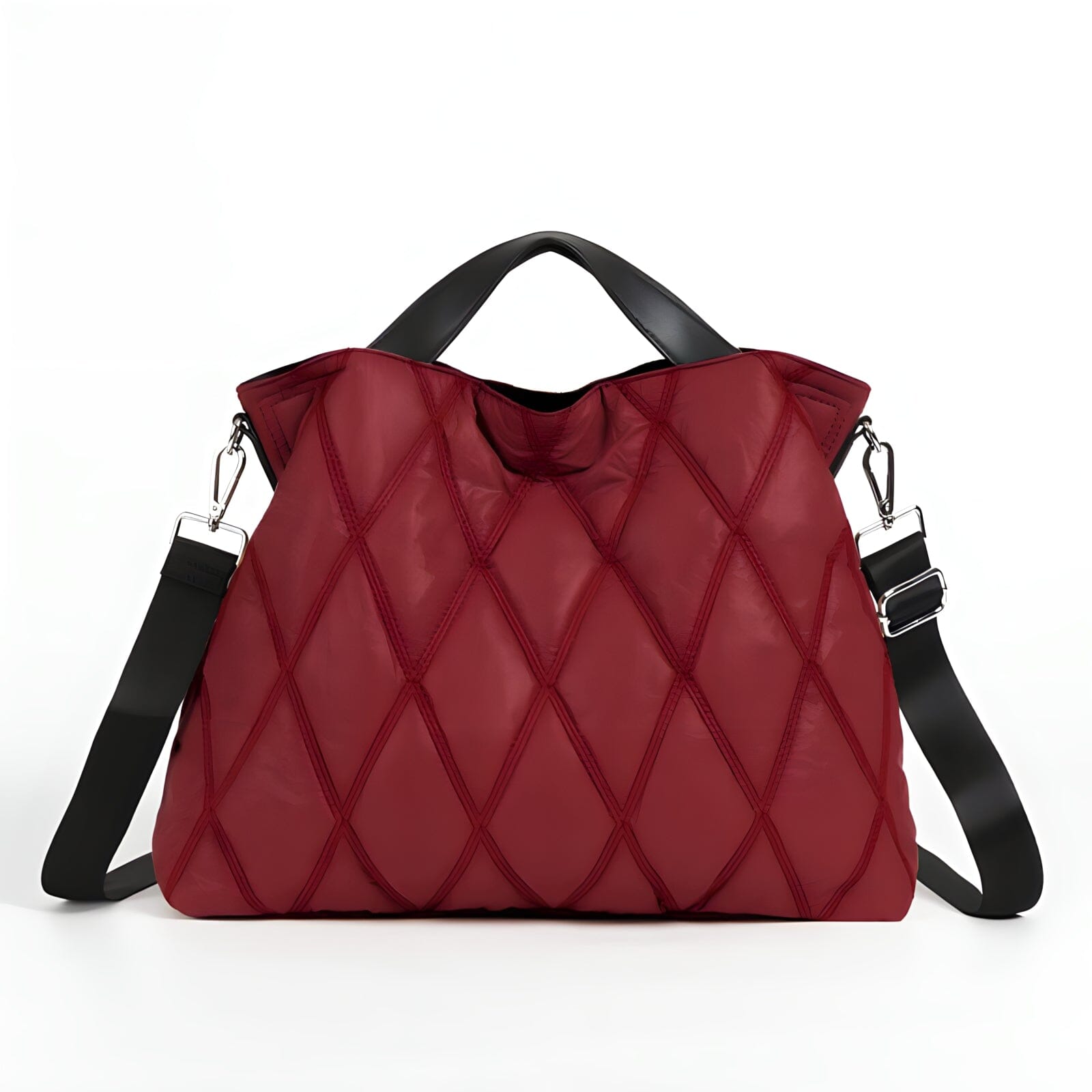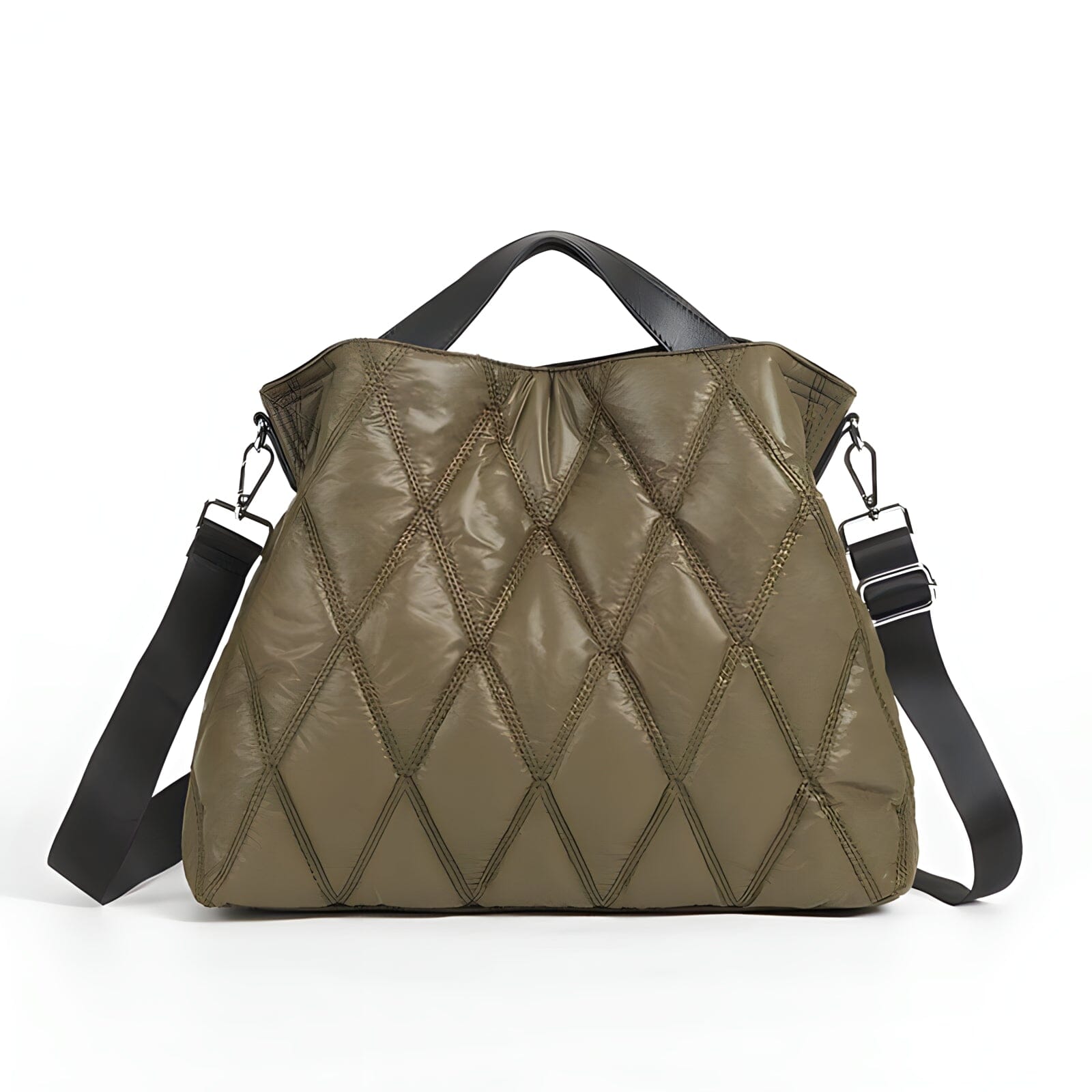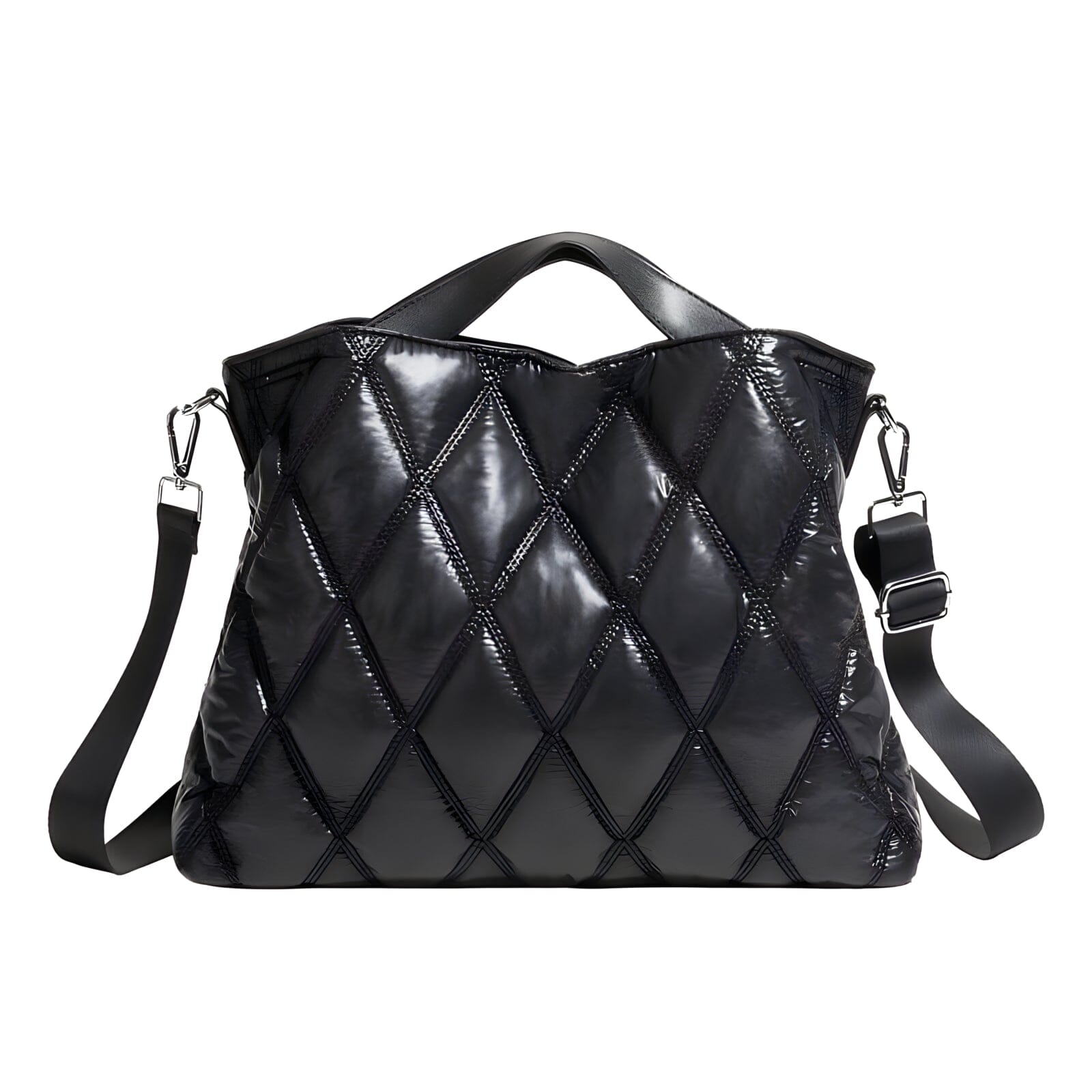 The "Campbell" tote bag features a plush quilted exterior design. supportive shoulder straps. and meticulous handmade craftsmanship throughout. Spacious construction offers ample room for everyday essentials and reveals a hidden interior zippered pocket. while side wallet and phone pockets provide added storage and functionality. Exclusively for the progressive modern woman.
