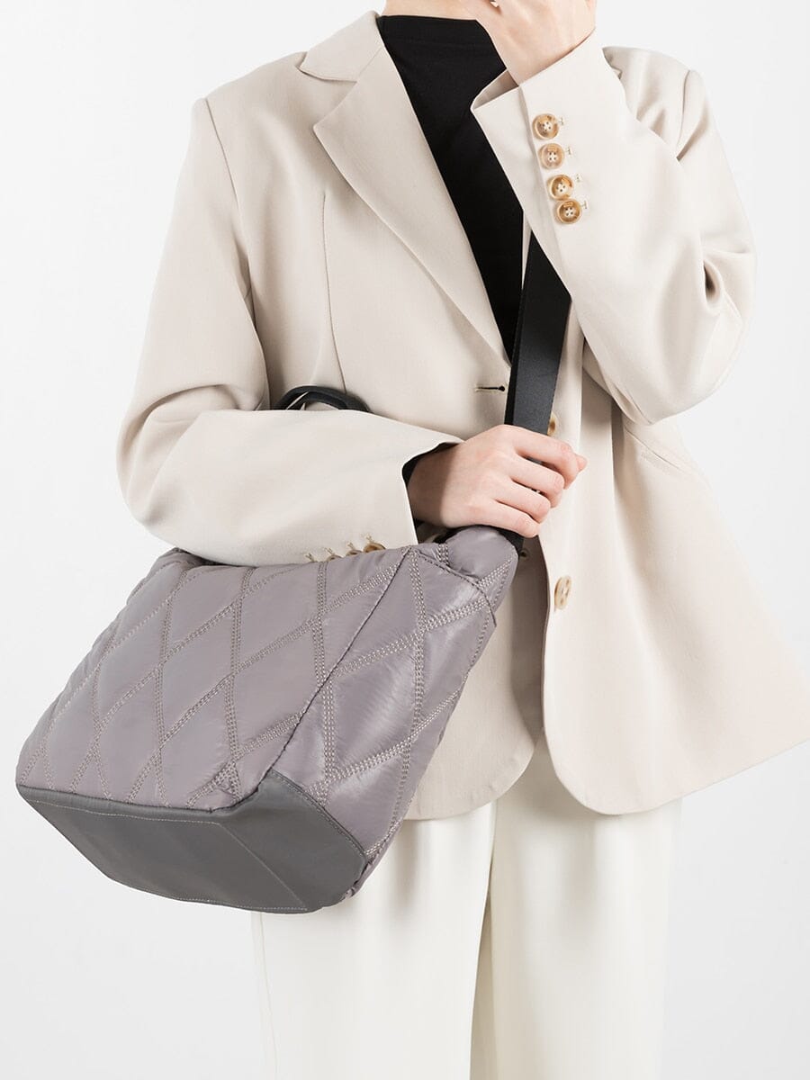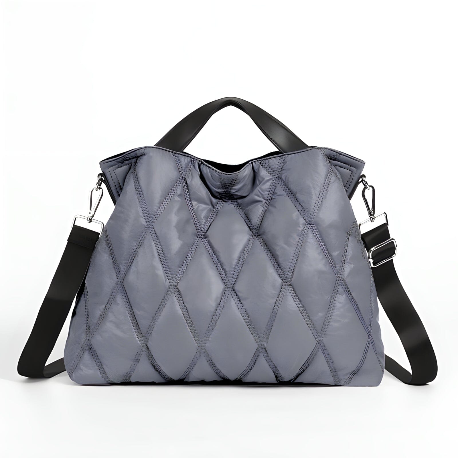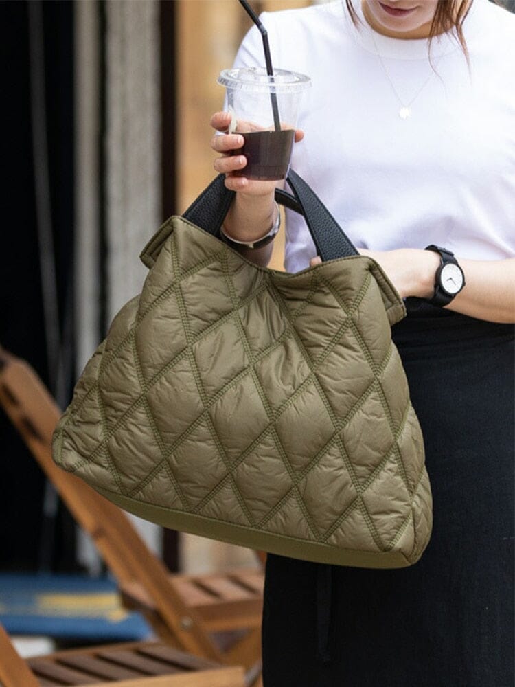 The "Campbell" tote bag features a plush quilted exterior design. supportive shoulder straps. and meticulous handmade craftsmanship throughout. Spacious construction offers ample room for everyday essentials and reveals a hidden interior zippered pocket. while side wallet and phone pockets provide added storage and functionality. Exclusively for the progressive modern woman.