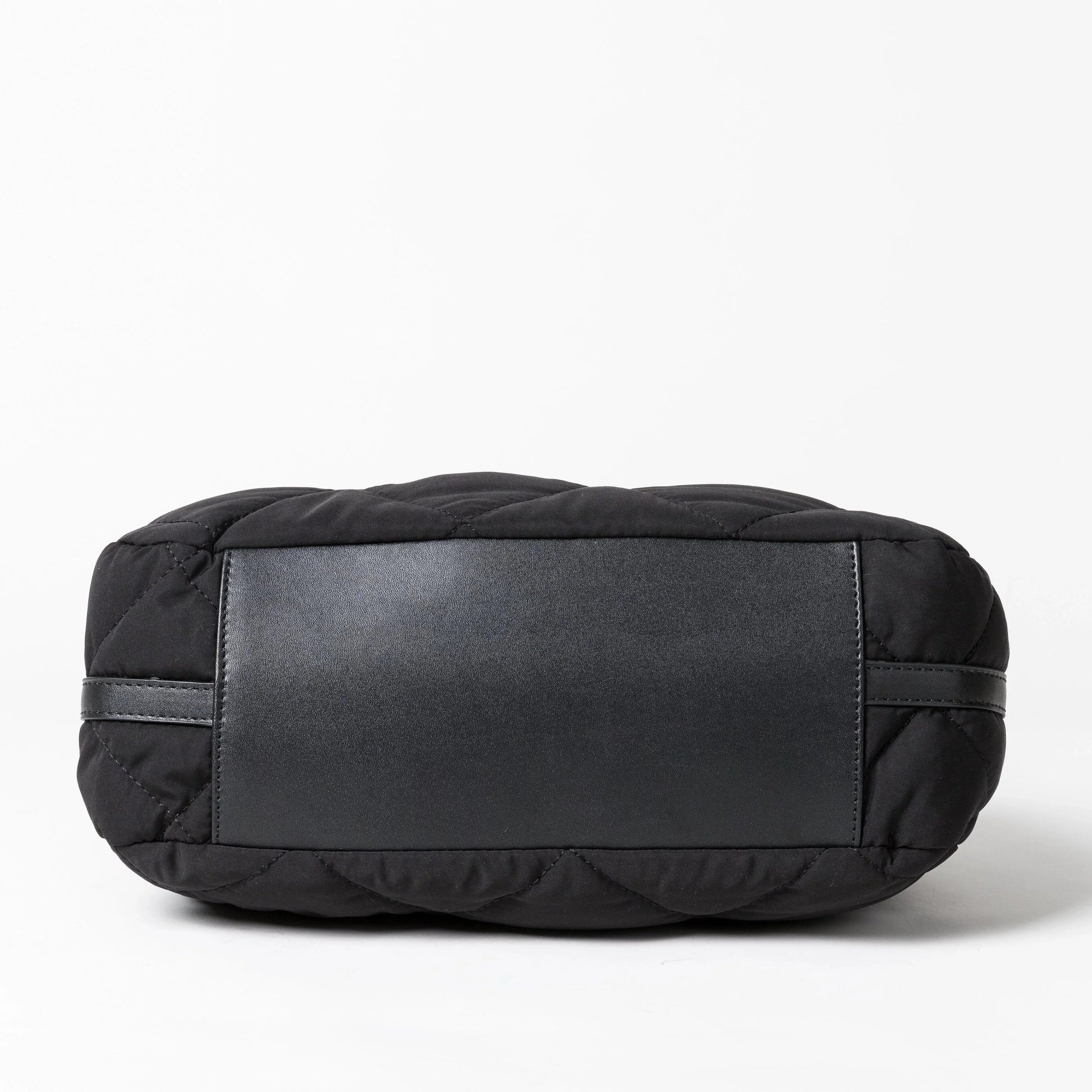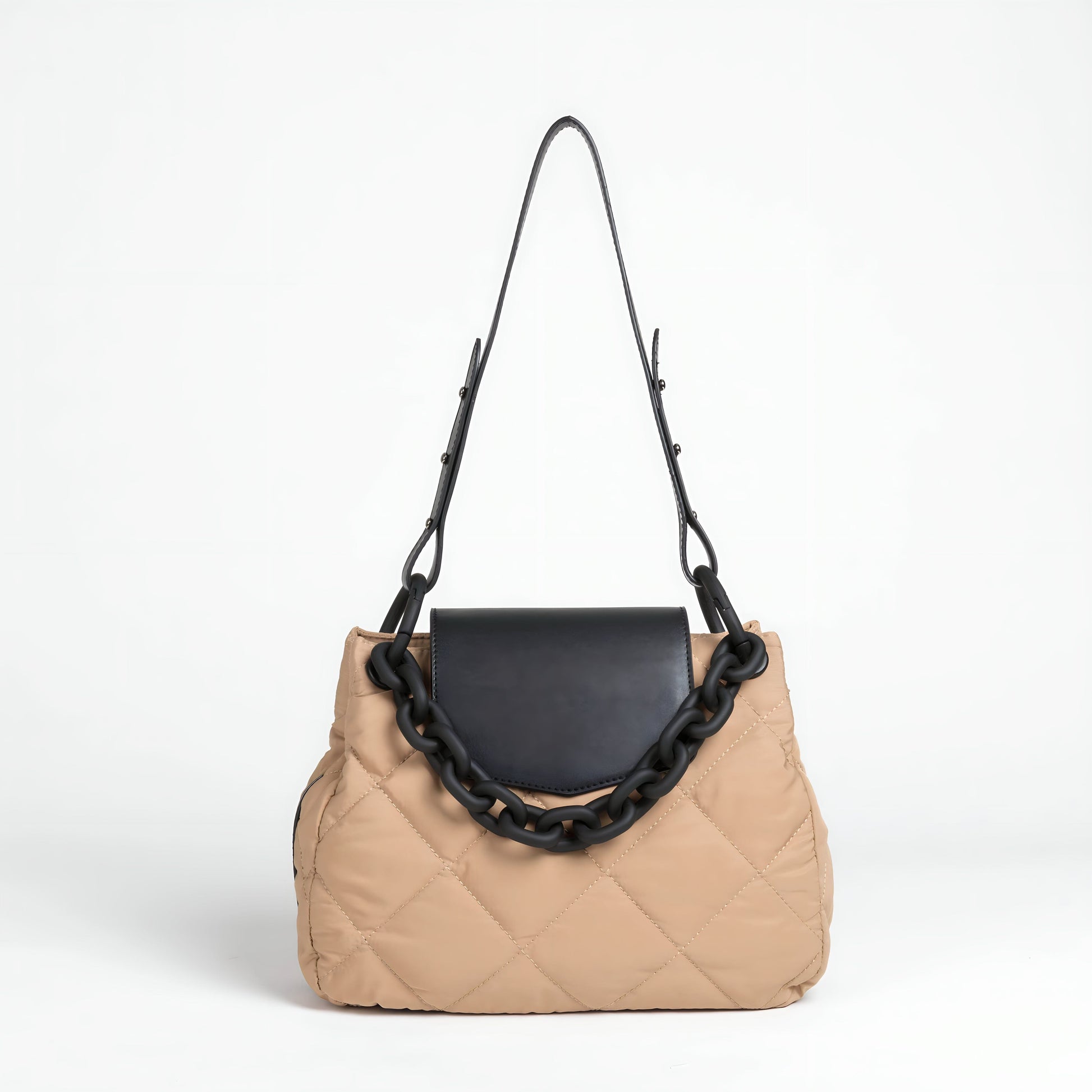 The "Merritt" shoulder bag features a plush quilted exterior design. supportive shoulder straps. chain link accent and meticulous handmade craftsmanship throughout. Spacious construction offers ample room for everyday essentials and reveals a hidden interior zippered compartment. while side wallet and phone pockets provide added storage and functionality. Exclusively for the progressive modern woman.