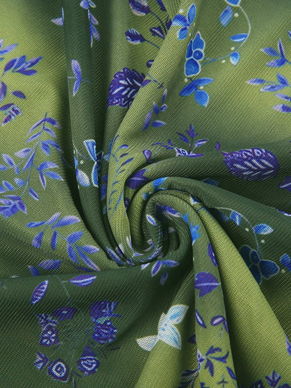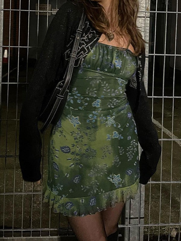 Description: Inspired by tie-dye & floral print allover. this such cute dress features ruched detail on the chest. it has an open back. and ruffle hemline design.