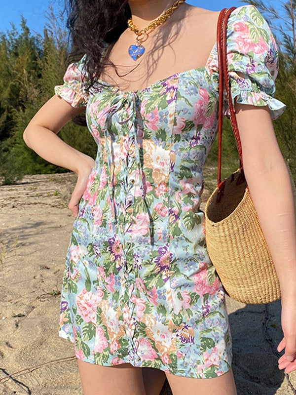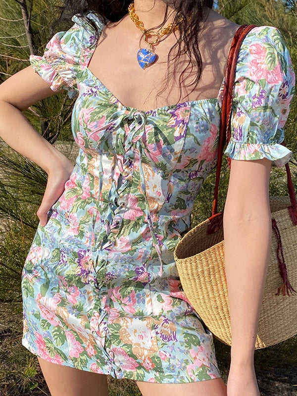 Description: Never go wrong with a floral mini dress for the summer season or holiday vacay vibes. This dress has retro-inspired floral print allover. features stretchy ruffle cuffs design. and with criss cross tie front fastening detail.